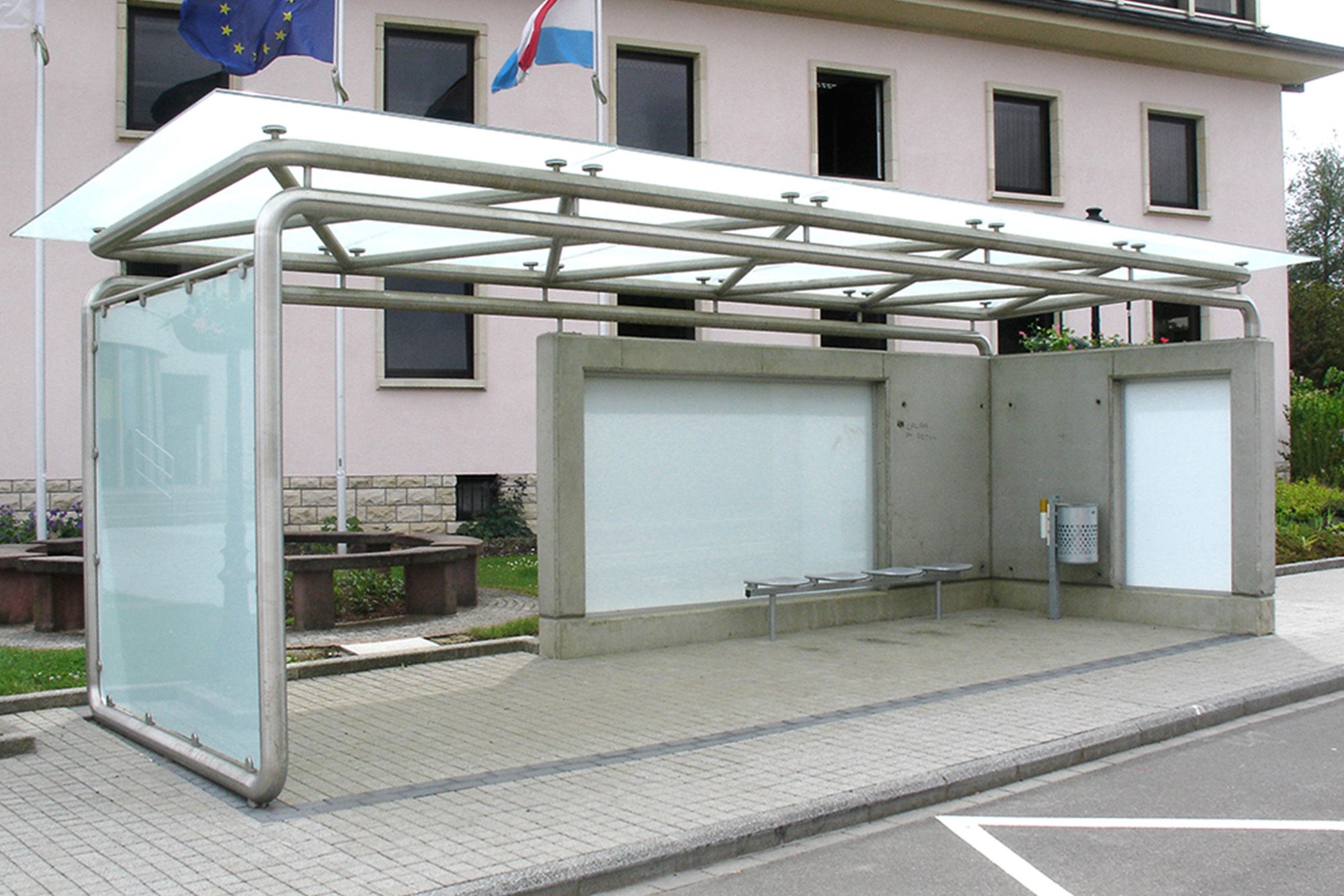 Ce grand abri d’autobus est conçu pour protéger des intempéries une bonne trentaine d’enfants. L’idée maîtresse du projet était de projeter cet abribus comme s’il était ‘mobi
