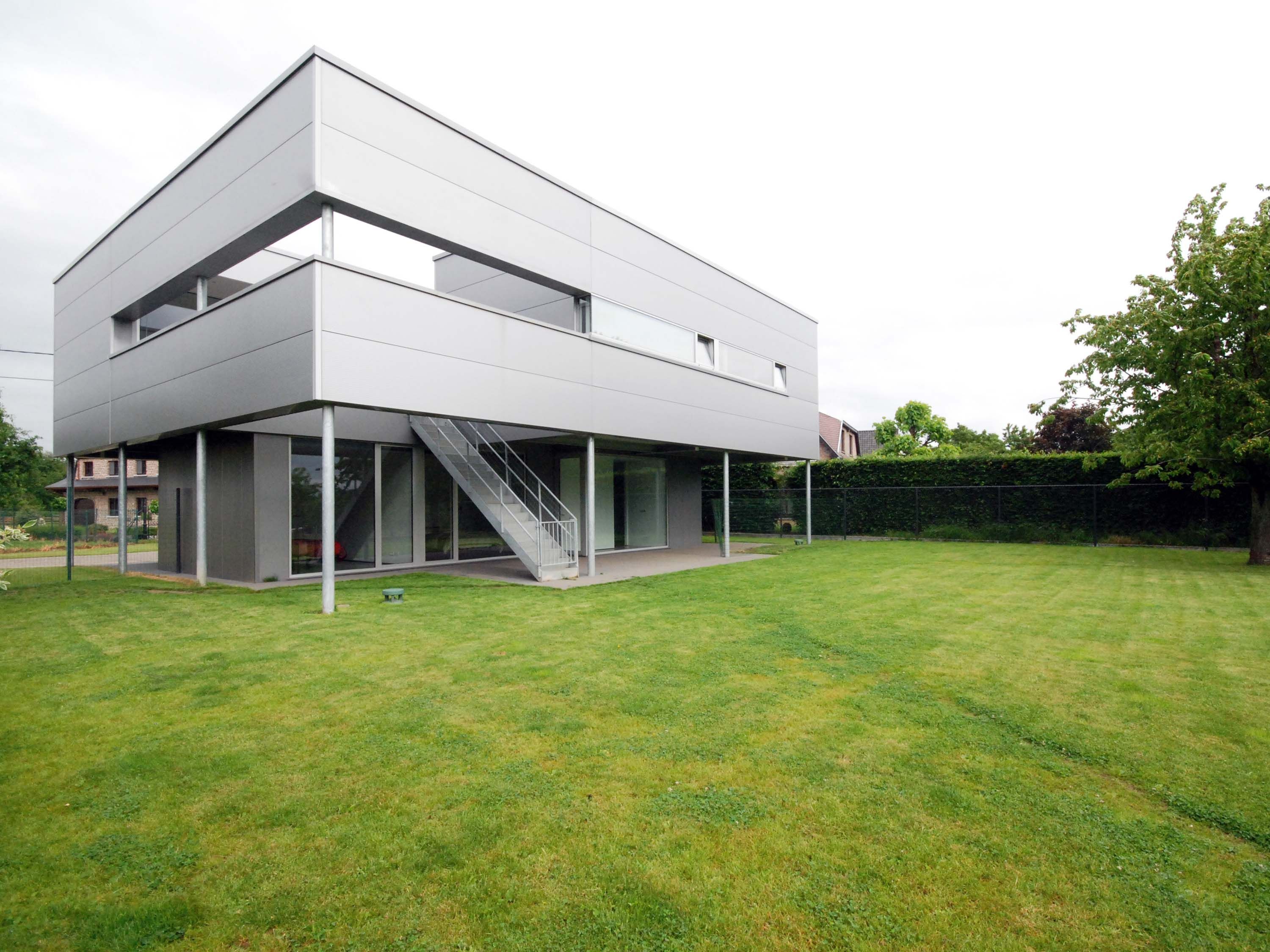 Ce bâtiment industriel avec logement est unique par sa situation : la parcelle était le dernier lot inoccupé d’une zone de PME qui borde à la fois une zone agricole et une zone résidentielle. Le hangar a logiquement été implanté du côté de la zone de PME, alors que la maison et les bureaux sont adjacents à la zone résidentielle. De cette manière, la maison bénéficie en plus d’une orientation sud et de la vue sur les champs.