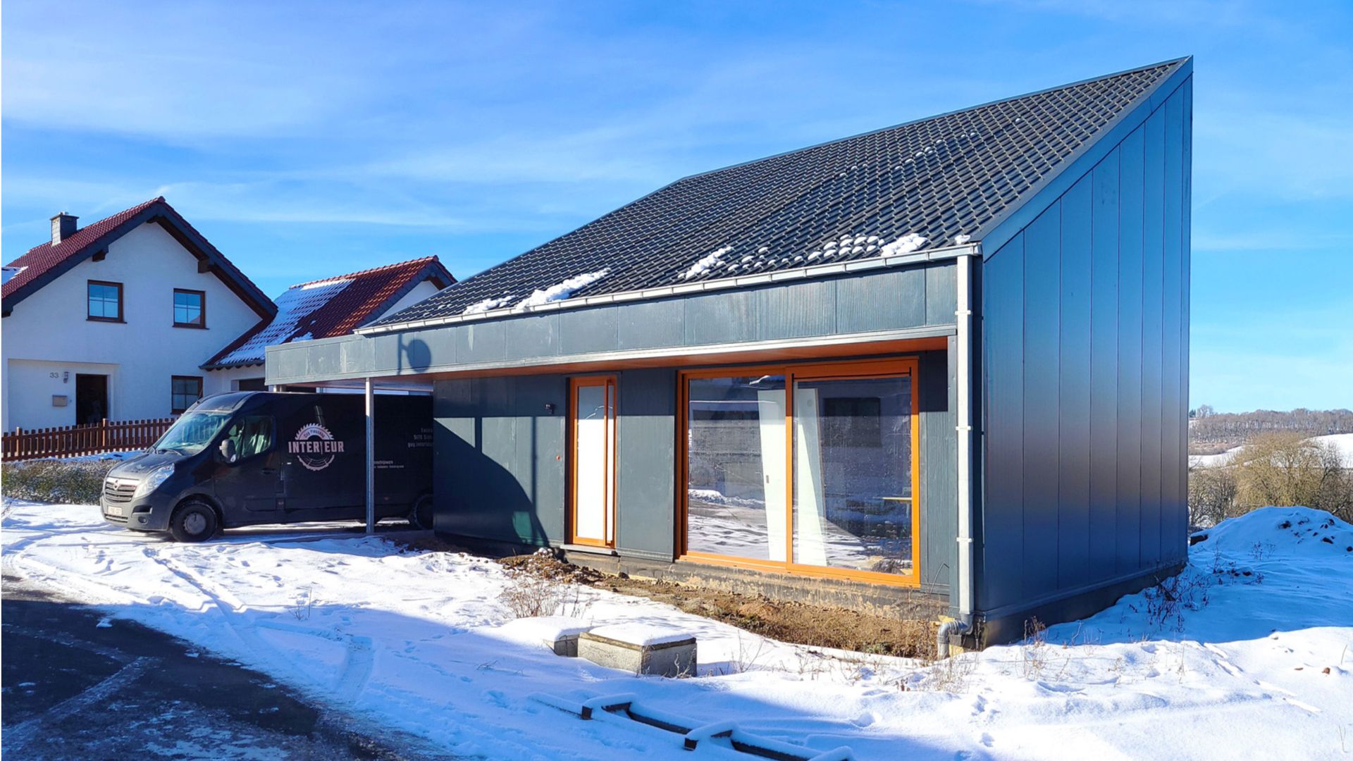 Cette maison de vacances a été construite dans la région de l'Eifel volcanique, au sud de Gerolstein (DE), à l'aide d'une structure porteuse à ossature en acier plié à froid et de panneaux sandwich isolés pour le revêtement du toit et des parois.