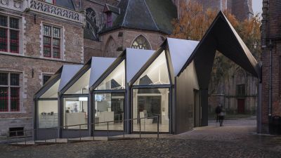 • Tekst: <p>Le pavillon d’accueil du musée Gruuthuse (Bruges) fait revivre la cour ancestrale située entre l’église Onze-Lieve-Vrouw, le palais Gruuthuse et le musée Oude Steen, renforçant l’aspect historique du site. <br />Dans ce contexte d’une valeur patrimoniale exceptionnelle, le pavillon se profile comme une construction contemporaine - un exosquelette d’acier et de verre - tout en faisant écho à l’expression formelle (néo)gothique des monuments environnants. <br />Il est conçu comme une structure métallique pliée, selon le principe structurel de la ‘folded plate’. Les plans du toit sont en acier plat de 6 mm et les colonnes en acier plat de 8 mm. Les plus grandes surfaces inclinées de l’auvent sont renforcées localement avec des ailettes soudées de 10 mm d’épaisseur. Les semelles IPE 100 fournissent la rigidité nécessaire dans les plans verticaux frontaux. Les détails minutieux de la structure métallique renforcent l’expression architecturale.</p>