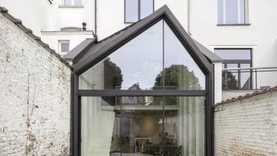 • Tekst: <p>Au centre de Bruxelles, cette habitation privée s’est vue radicalement transformée grâce à l’ajout en façade arrière d’une extension en acier (4 x 4,5 x 6 m haut ; ± 4500 kg) conçue d’une seule pièce avec escalier intégré. <br />La préfabrication en atelier (3 semaines + 1 semaine de mise en peinture) a permis d’installer le nouveau module en 3 heures seulement. <br />Cette annexe se compose d’une simple tôle d’acier de 5 mm d’épaisseur, raidie par un ensemble de 5 portiques de 20 mm d’épaisseur pour 100 mm de large. Cette structure épurée permet d’optimaliser l’espace généré par l’intervention. Avec mise en peinture en atelier, l’acier devient la signature visuelle et la peau intérieure du projet. Par ailleurs, la coque en acier est étanche et sert donc de pare-vapeur naturel vis-à-vis de l’isolation extérieure qui l’entoure totalement. L’acier étant recyclable à 100 %, on peut imaginer que le module puisse à l’avenir être extrait du projet et recyclé intégralement.</p>