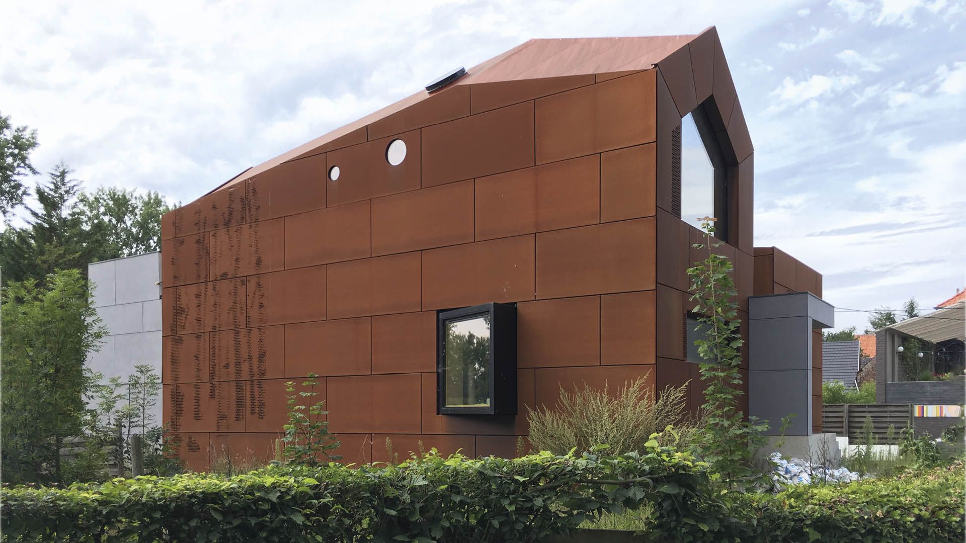 Un salon de thé au bord des Zoete Waters à Oud-Heverlee, datant des années ‘50, connaît une deuxième vie en tant que centre de bien-être et maison (de vacances) luxueuse. Le volume existant a été rehaussé de portiques en acier et de menuiseries en bois, après quoi l’ensemble a été revêtu d’acier auto-patinable (‘corten’) pour lui donner un aspect homogène et pour relier visuellement toutes les pièces de la maison.