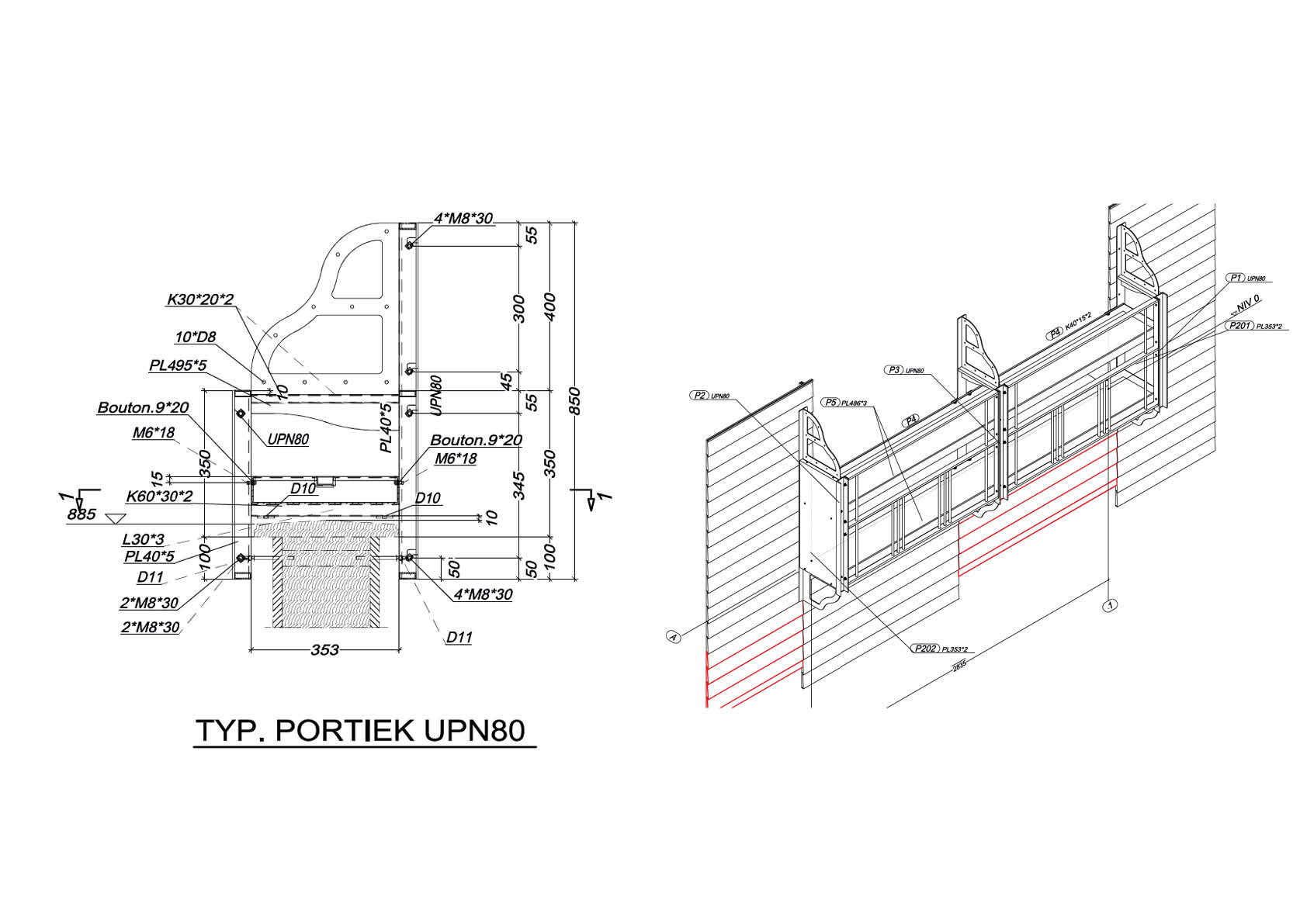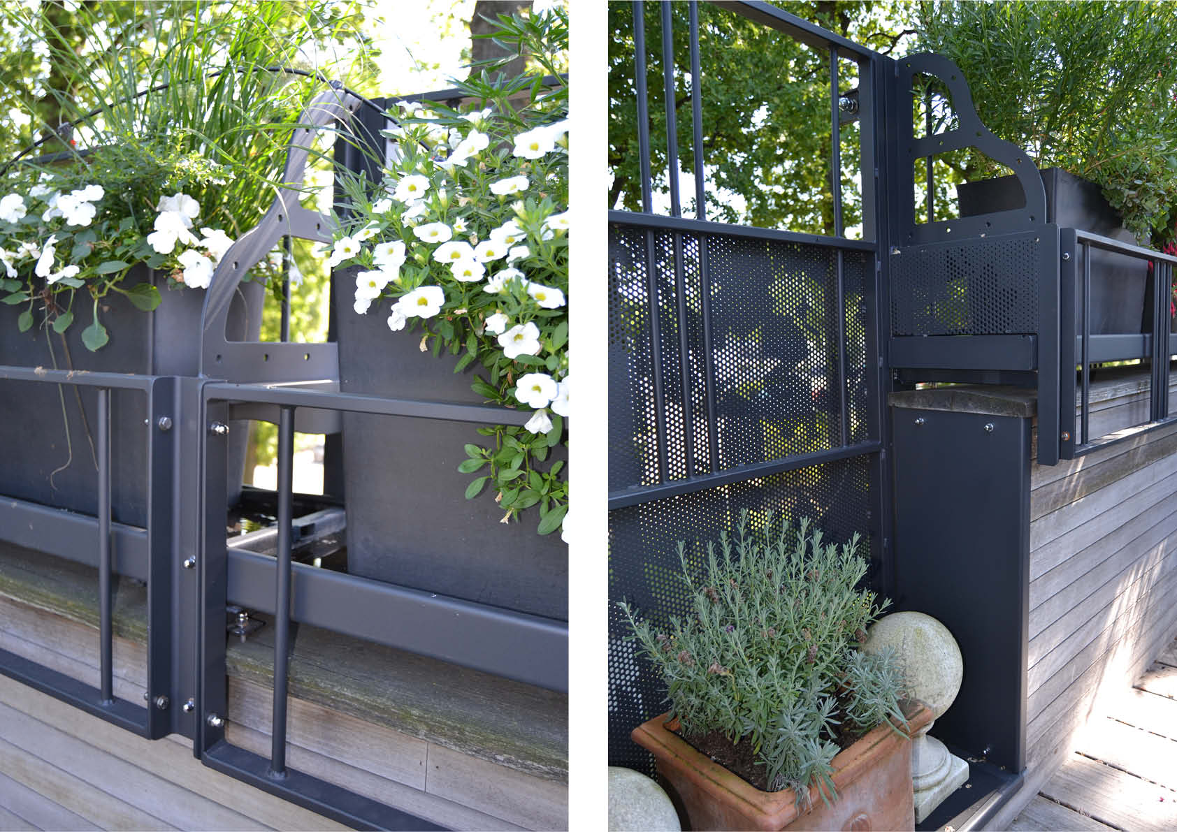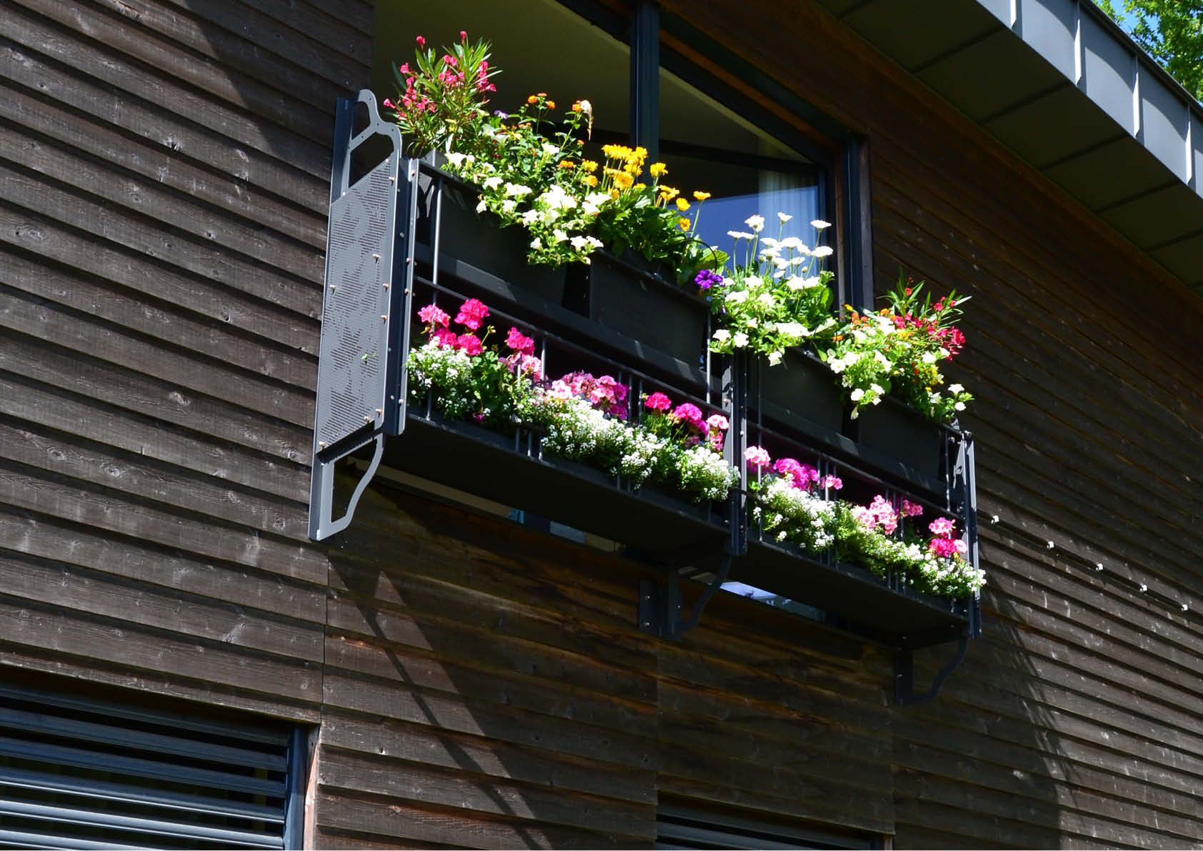Des profilés tubulaires et des UPN classiques ont été utilisés pour les portiques en acier. Les jardinières ont été découpées au laser dans une plaque plane, pliées et rendues étanches aux extrémités à l’aide d’une bande soudée. Les balustrades sont construites en profilé tubulaire et en bande.