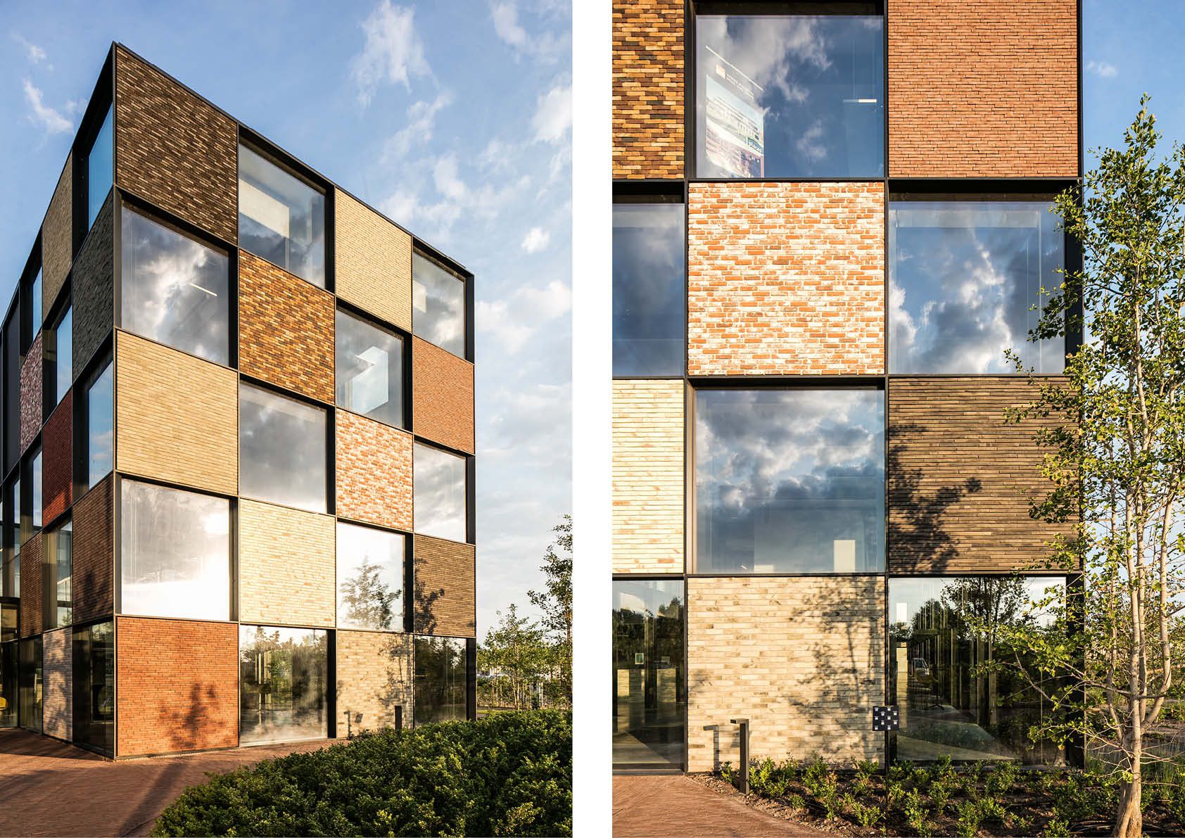 Pour le réaménagement complet des environs et du nouveau siège de la Briqueterie Vande Moortel sur les rives de l’Escaut à Audenarde, l’architecte et le maître d’ouvrage ont opté pour une forme pure et rectangulaire, rappelant une brique ou un pavé en terre cuite. Le bâtiment est conçu comme un entrepôt moderne.