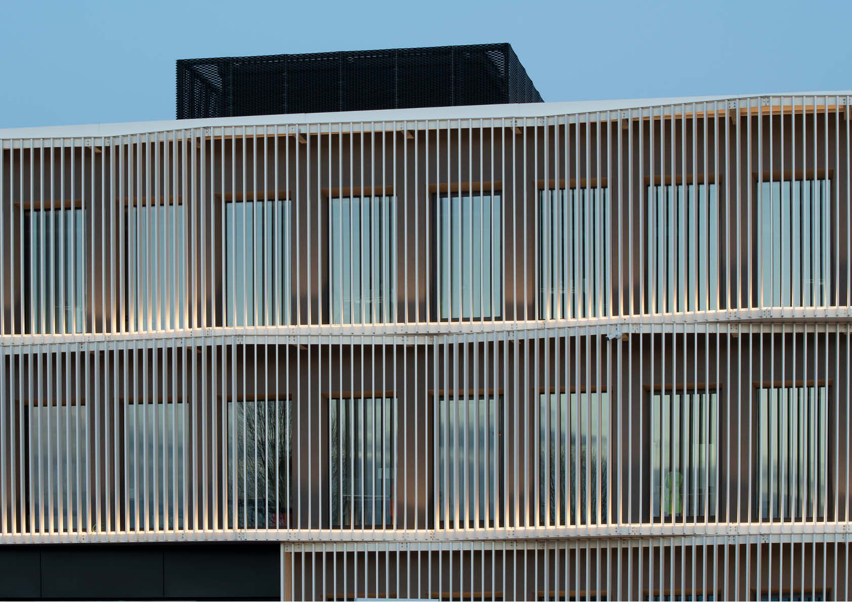 Concrètement, une infrastructure en acier a été suspendue au squelette de la base en béton et une structure en acier impressionnante a été ajoutée au nord du bâtiment pour soutenir les nouvelles terrasses. Ces ossatures en acier sont devenues le support des différents éléments de façade : lamelles, plafonds, passerelles et revêtements de façade.