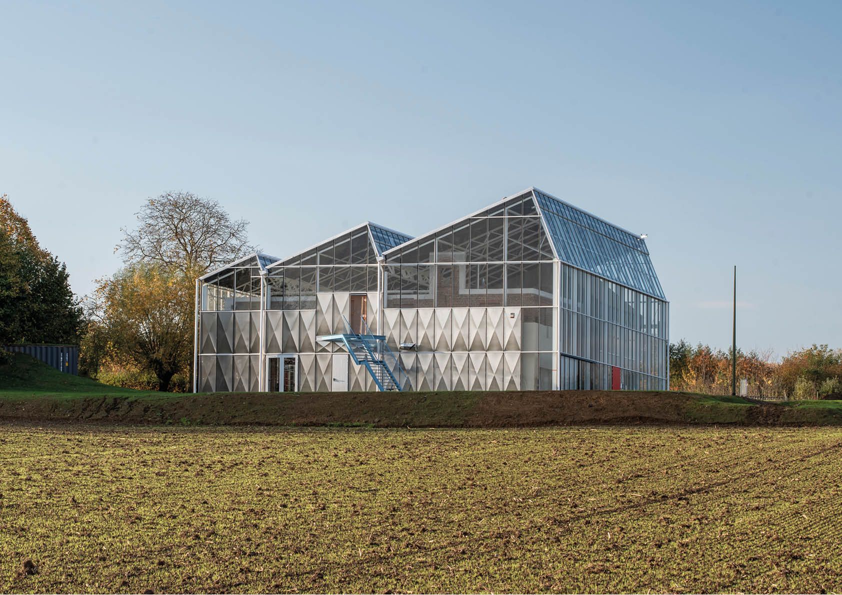 La serre, qui a été construite autour d’un squelette en acier — bon pour 23 tonnes — a une toiture à redans inclinée, qui permet un éclairage idéal depuis le nord. Un climat intermédiaire prévaut au sein de la serre non chauffée. Les visiteurs y sont à l’abri de la pluie et du vent et peuvent quand même profiter de la vue magnifique sur la région.