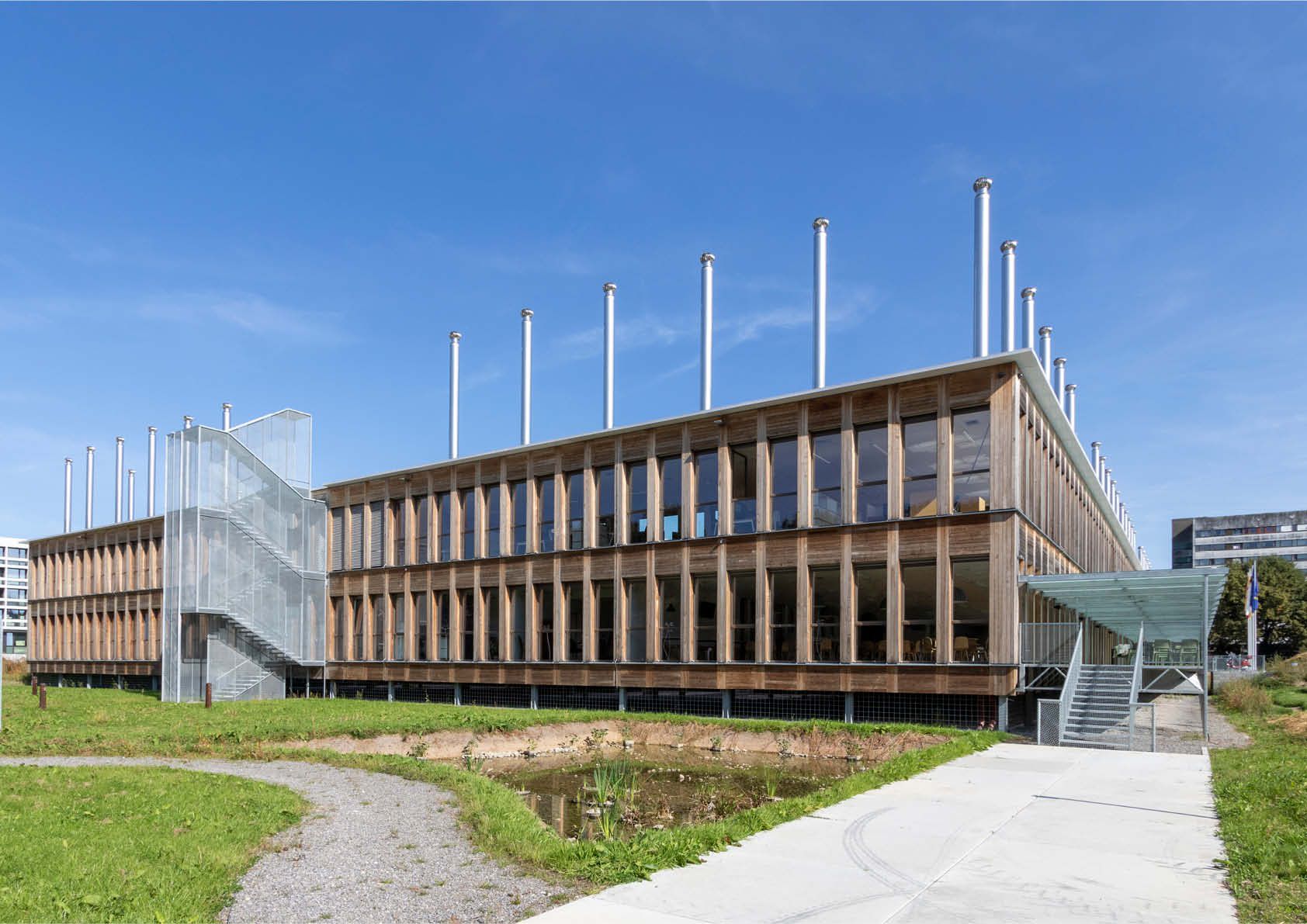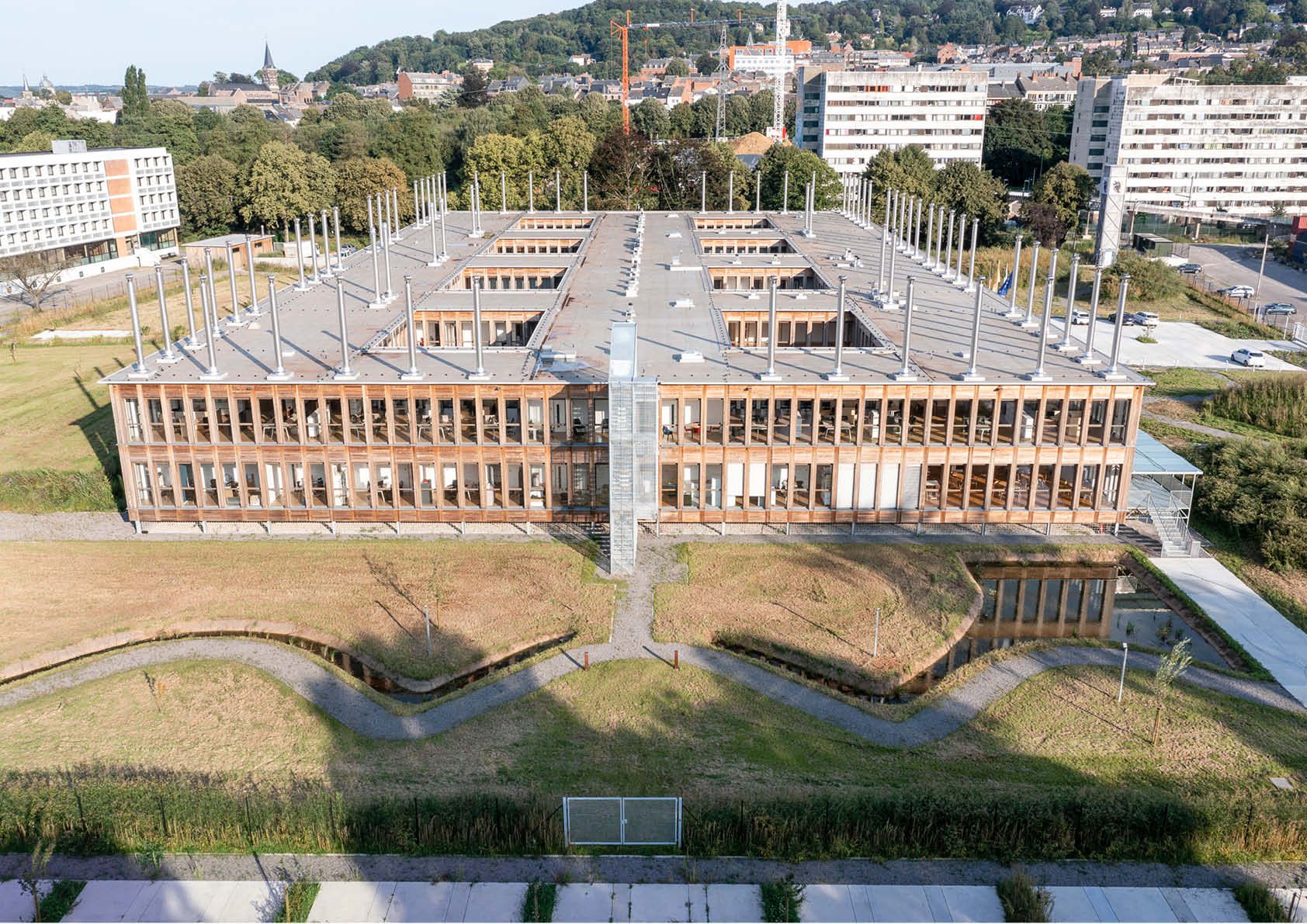Pour rassembler ses services sur un même site, la Province de Namur a fait construire un nouveau siège, entièrement en bois et en acier. Le bâtiment rectangulaire, tout en bois, est posé sur des pilotis en acier galvanisé.
