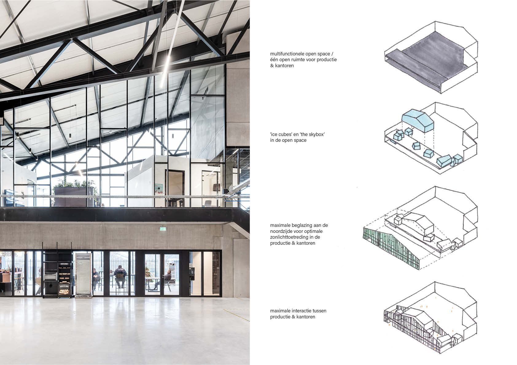 Le Creative Cooling Group s’est en effet installé sur une ancienne base de l’armée britannique et a opté pour un juste milieu entre construction neuve et rénovation. Une partie des hangars militaires existants ont été réaménagés et complétés par un nouveau bâtiment de grande hauteur, qui a aussi reçu une toiture à deux versants avec charpente en acier. De subtils clins d’œil architecturaux à l’activité principale de l’entreprise complètent le tableau.