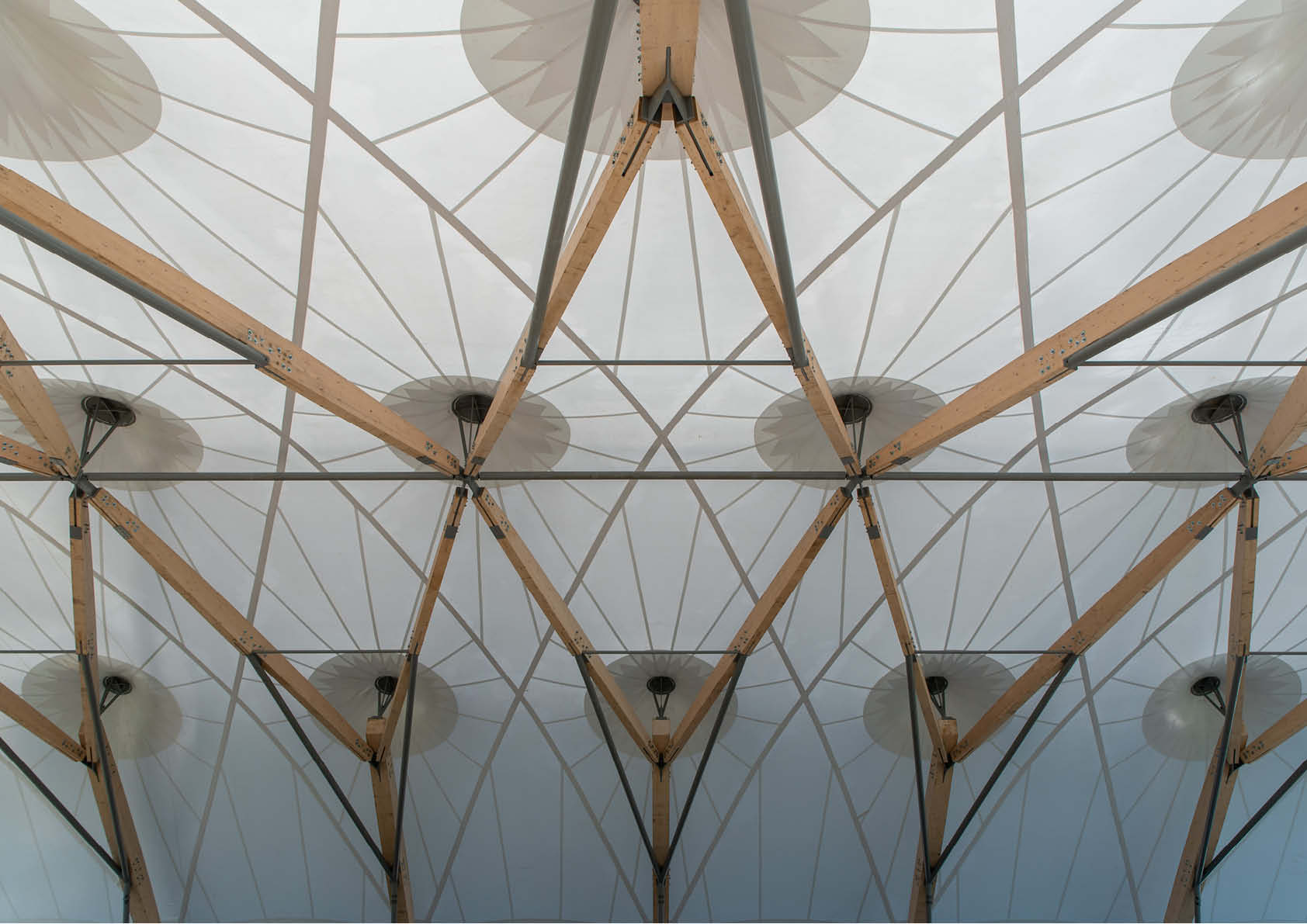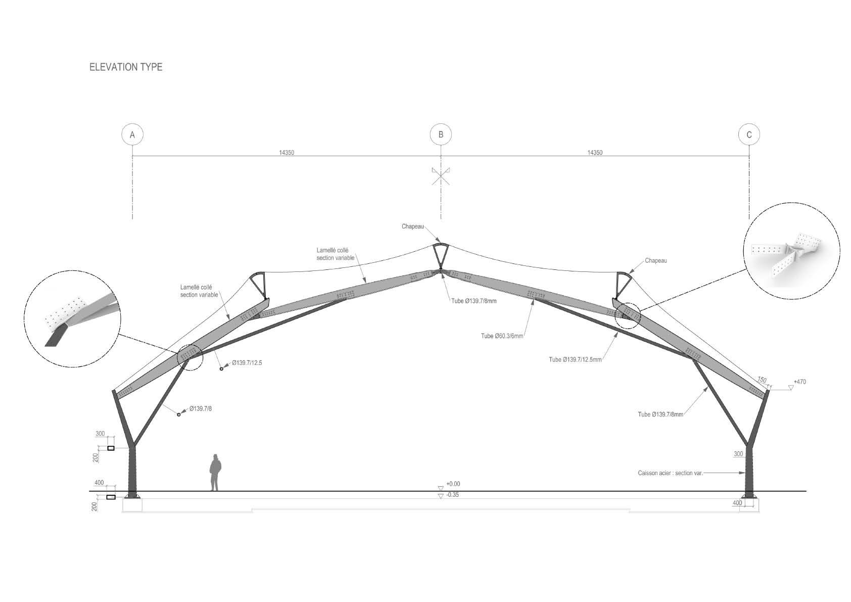 La partie supérieure de ces portiques sur laquelle « s’appuie » les pièces de support de la toile sont des poutres en bois lamellé-collé en forme de Y. Tous les autres éléments des portiques, comme les colonnes (caissons PRS à géométrie variable), les bracons ainsi que les assemblages de géométries complexes entre poutres ont été réalisés en acier S355. Au total, ils mesurent chacun plus de 10 mètres. Dans un souci d’esthétique, les assemblages entre les poutres bois elles-mêmes et ceux de ces poutres en bois avec la structure acier sont pratiquement invisibles.