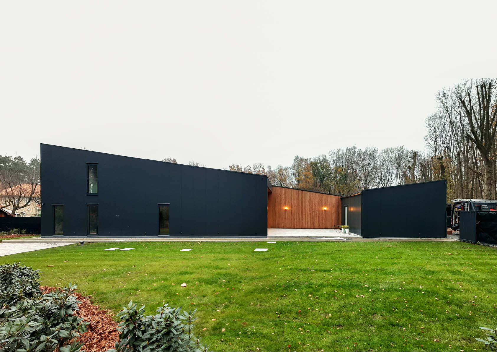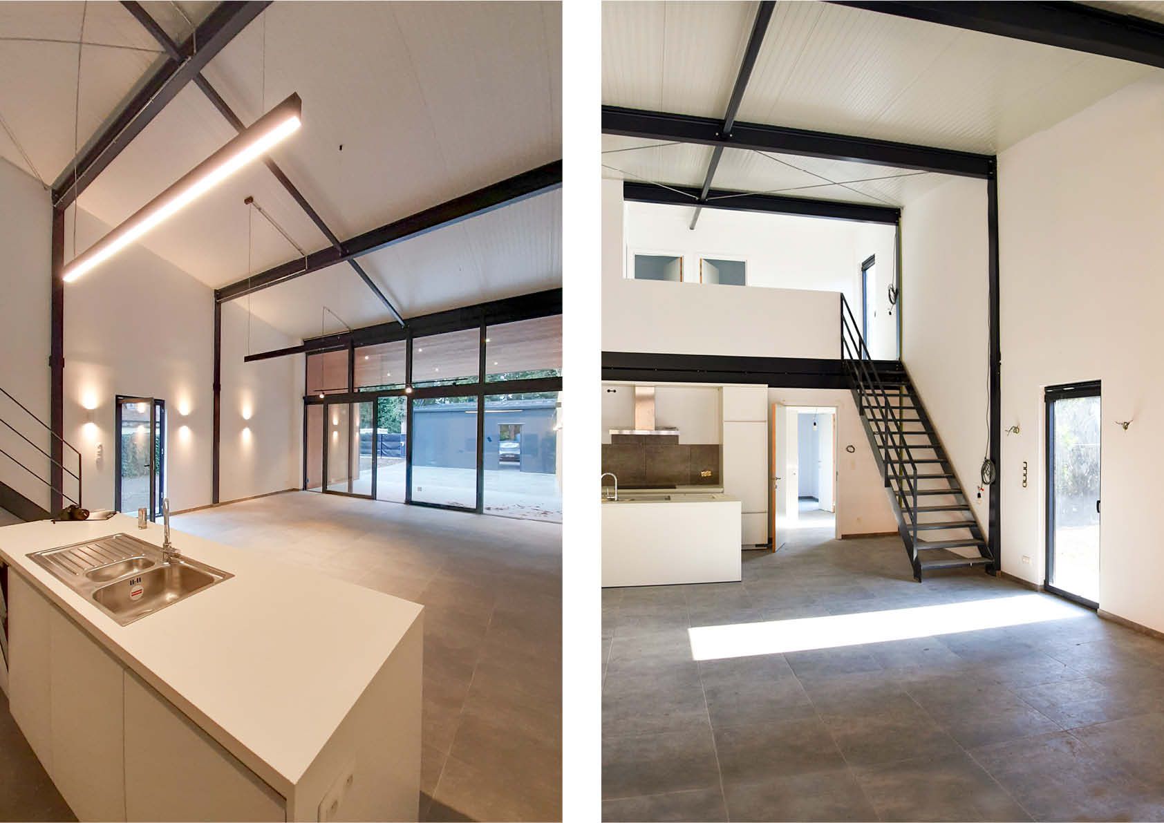 Dans un environnement verdoyant à la frontière entre la Belgique et les Pays-Bas, une maison délabrée a fait place à une maison bifamiliale intégrée et moderne. Les deux habitations devaient avoir un look industriel et de grands espaces de vie ouverts.