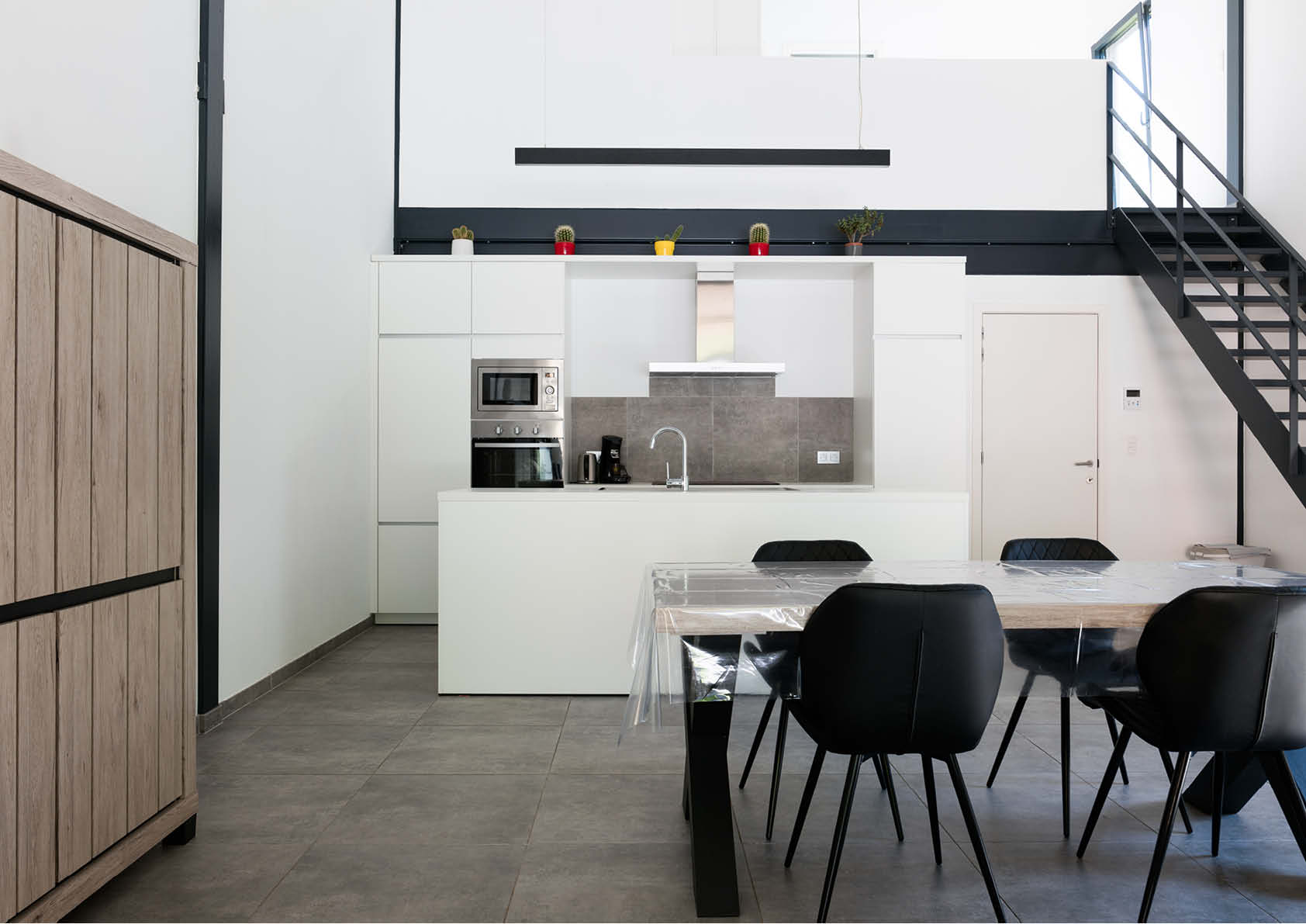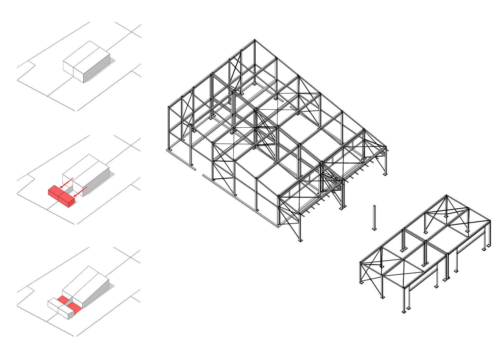 Le choix d'une structure en acier s'est donc imposé, pour que la phase d'exécution soit aussi courte que possible - l'ensemble du processus, de la démolition aux finitions intérieures, n'a duré que neuf mois ! – mais aussi pour des raisons économiques et écologiques (recyclage). Les murs et le toit sont intégralement revêtus de panneaux sandwichs industriels de couleur gris anthracite. La face antérieure du toit surplombant le pignon vitré pour éviter la surchauffe, ainsi que les murs donnant sur les terrasses sont habillés de bois, ce qui offre un élégant contraste visuel.