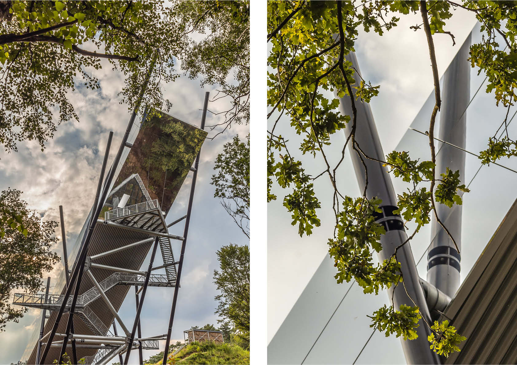 Pour augmenter la rigidité et permettre de grands porte-à-faux, ce tracé en éclair est construit à partir de poutres soudées constituées de tubes scellés avec du métal déployé pour faire office de garde-corps. Grâce à un revêtement de 890 m² de cassettes en aluminium réfléchissant, la dry slope s'intègre parfaitement dans l'environnement boisé.