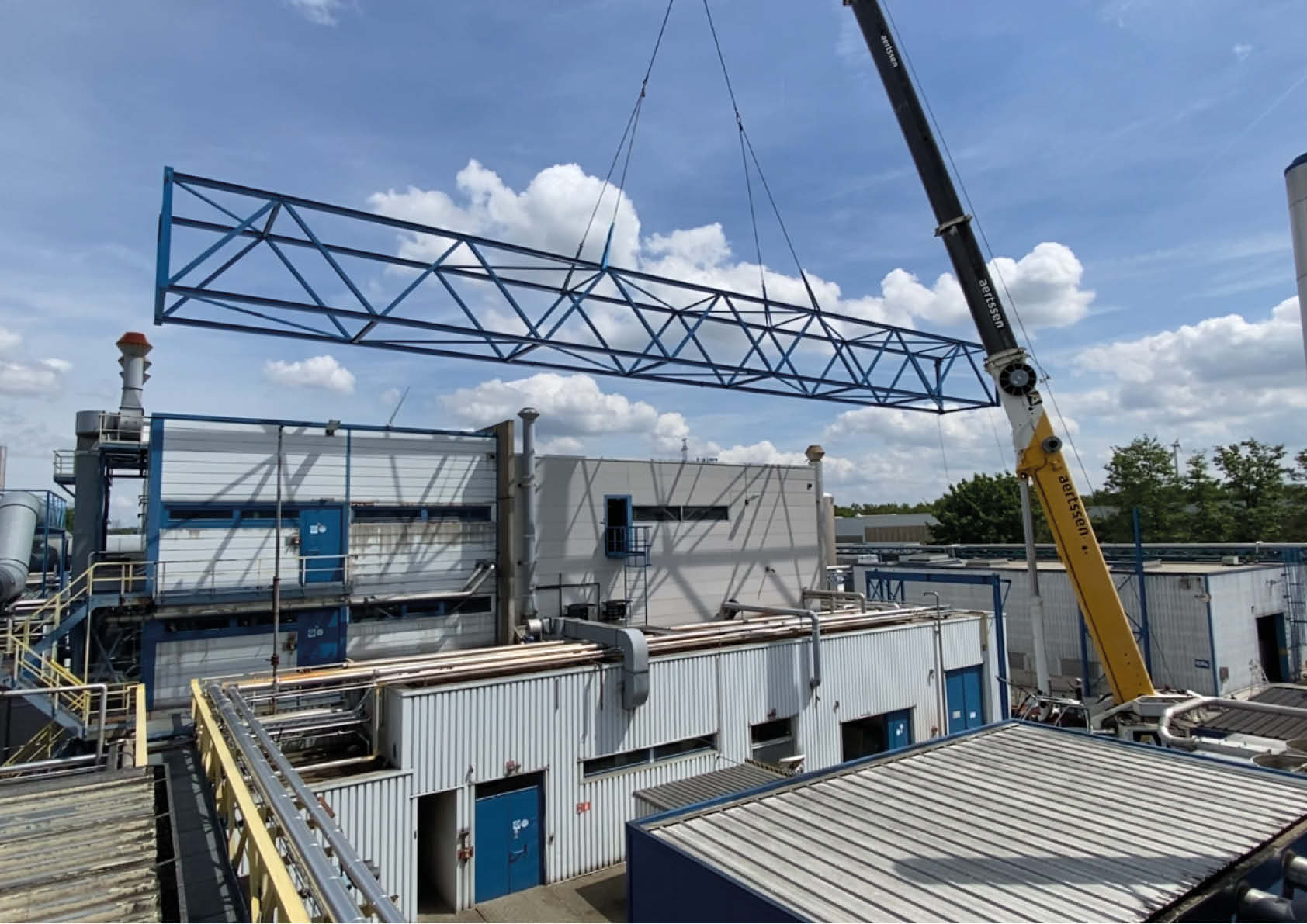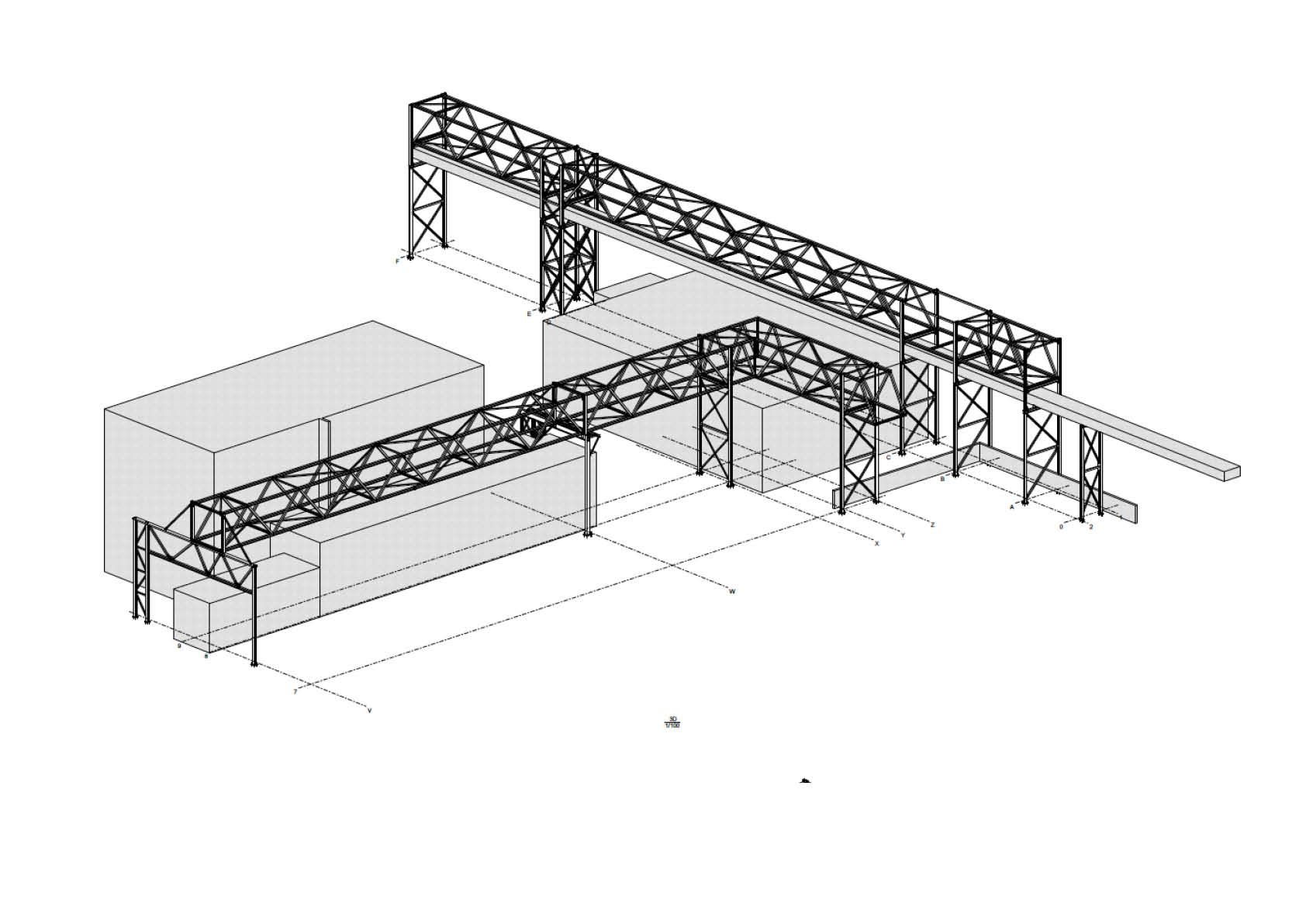 La première section se trouve au-dessus d'un bâtiment sur lequel on trouve un grand nombre de tuyaux, de plateformes, d'escaliers et d'échelles. La deuxième section passe au-dessus d'une passerelle de conduites existante et complètement indépendante de la nouvelle structure. L'exécution finale en treillis comprend 43,5 tonnes d'acier S235JR. L'ensemble a été métallisé et recouvert de deux couches de peinture RAL 5019. Les colonnes et les passerelles ont été préassemblées au sol, puis hissées en place à l'aide d'une grue lourde (140 tonnes).