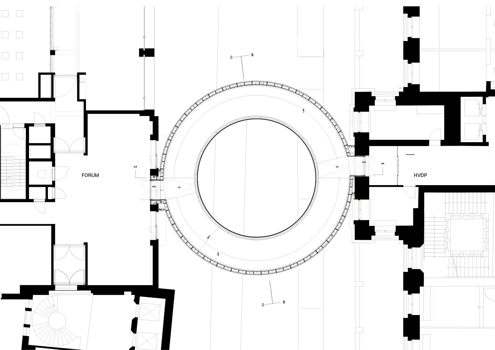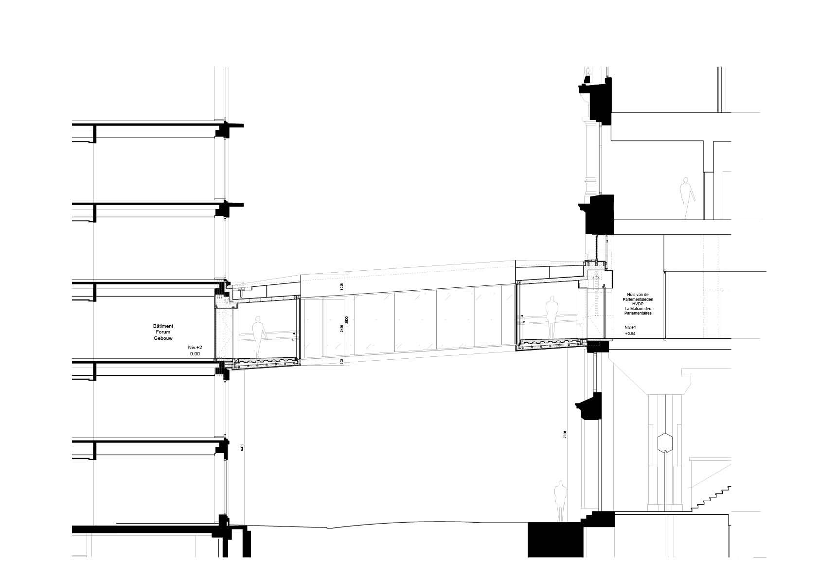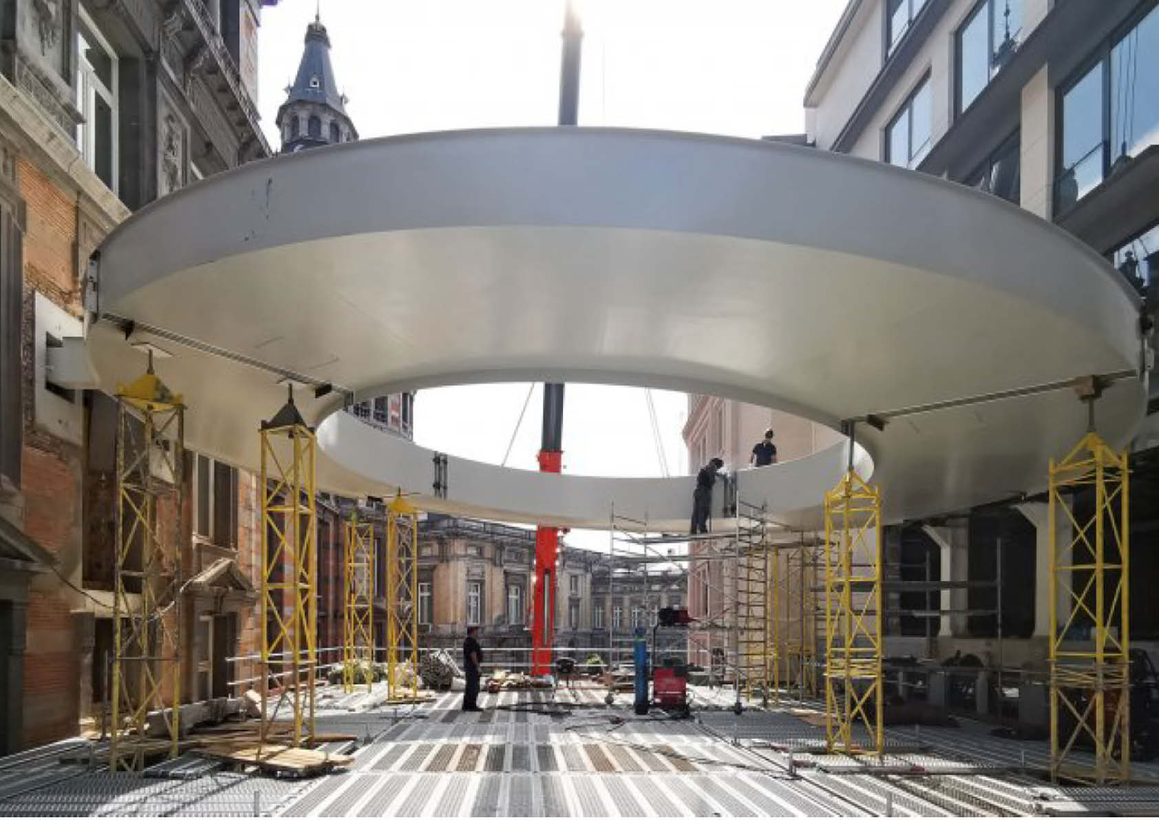 Les parlementaires fédéraux qui doivent se déplacer entre l’historique Palais de la Nation et le Forum, le nouveau complexe de conférences situé de l’autre côté de la rue, n’ont plus à le faire en plein air. Depuis peu, ils peuvent traverser par une jolie passerelle en forme d’anneau aux façades en miroir. Légèrement inclinée, la passerelle a été baptisée « Tondo » en référence aux peintures rondes très populaires à la Renaissance. Elle est en grande partie en acier.