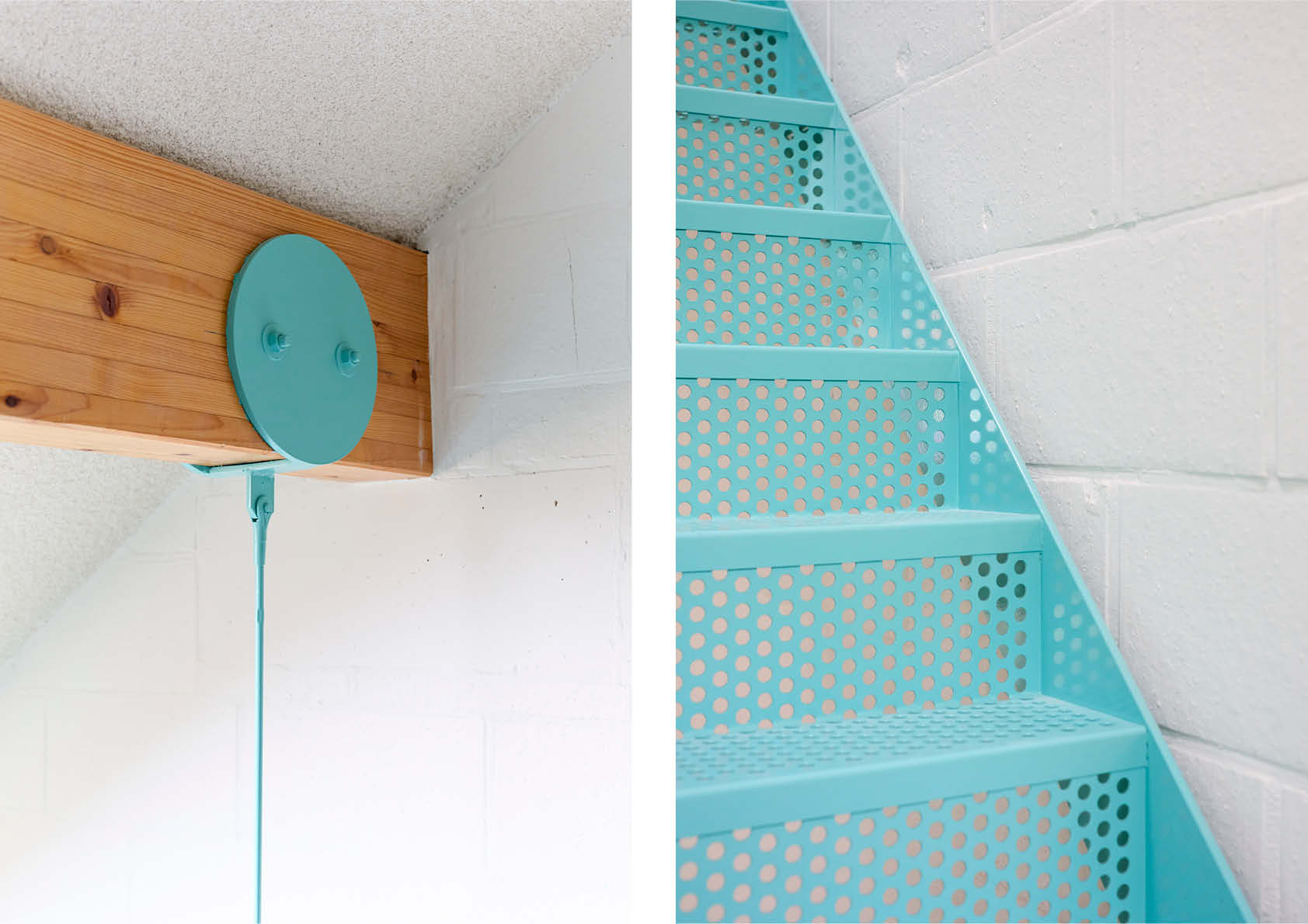Les escaliers assortis et les balustrades adaptées aux enfants ont été construits en tôles d'acier perforées. Cela a permis de créer des cocons silencieux et fermés, mais qui laissent tout de même passer suffisamment de lumière et offrent des vues sur les salles de classe situées en dessous. Les mezzanines sont peintes dans une couleur bleu-vert déjà présente dans le bâtiment. Petit avantage supplémentaire, les structures en acier boulonné sont magnétiques et peuvent donc également servir de tableaux magnétiques éducatifs.