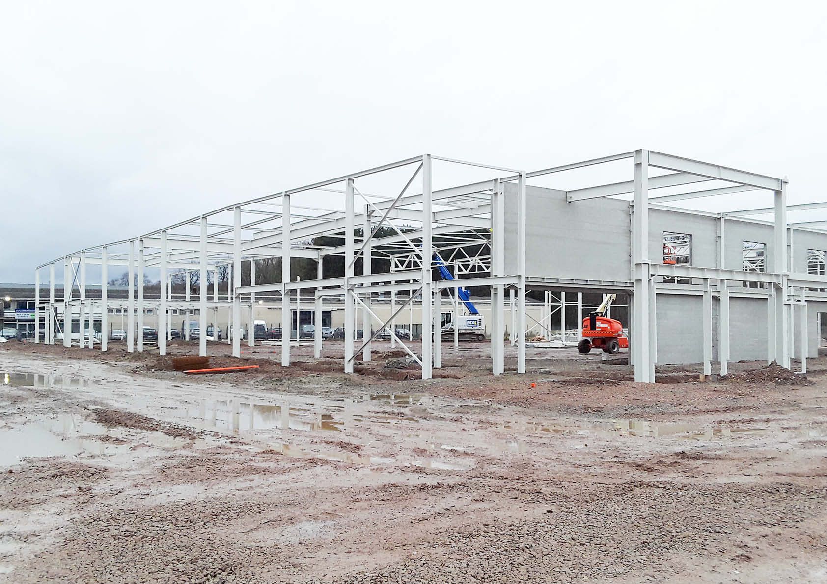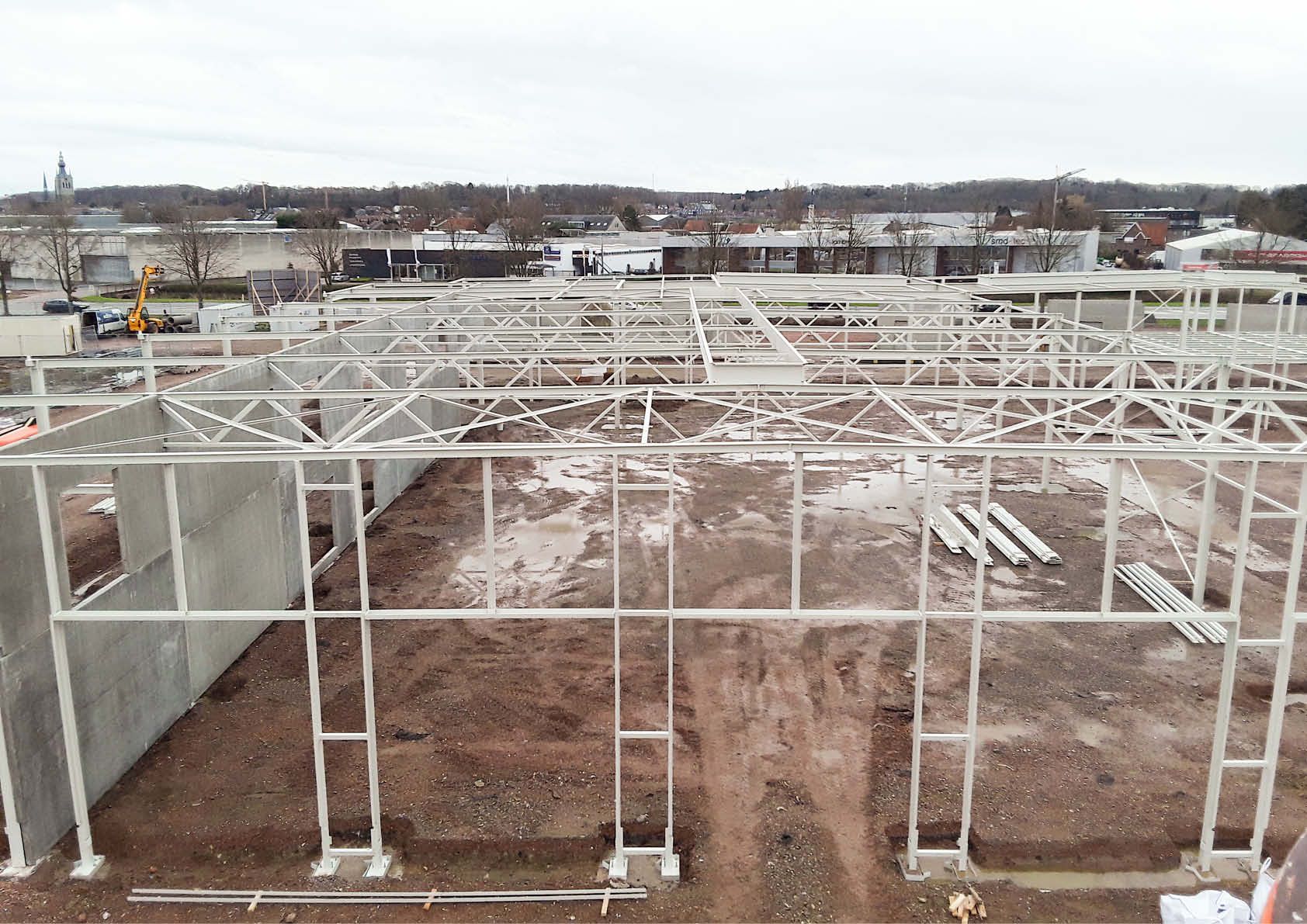 Comme le calendrier était très serré et que l’exécution devait être très rapide, une structure métallique complète a été privilégiée, tant pour les planchers des étages que pour la toiture (charpentes, poutres pleines, etc.). La façade a également été revêtue de 2150 m² de panneaux sandwichs en acier isolés et 4500 m² de panneaux de toiture en acier profilé ont été utilisés. Au total, pas moins de 215 tonnes d'acier ont été intégrées dans le bâtiment.