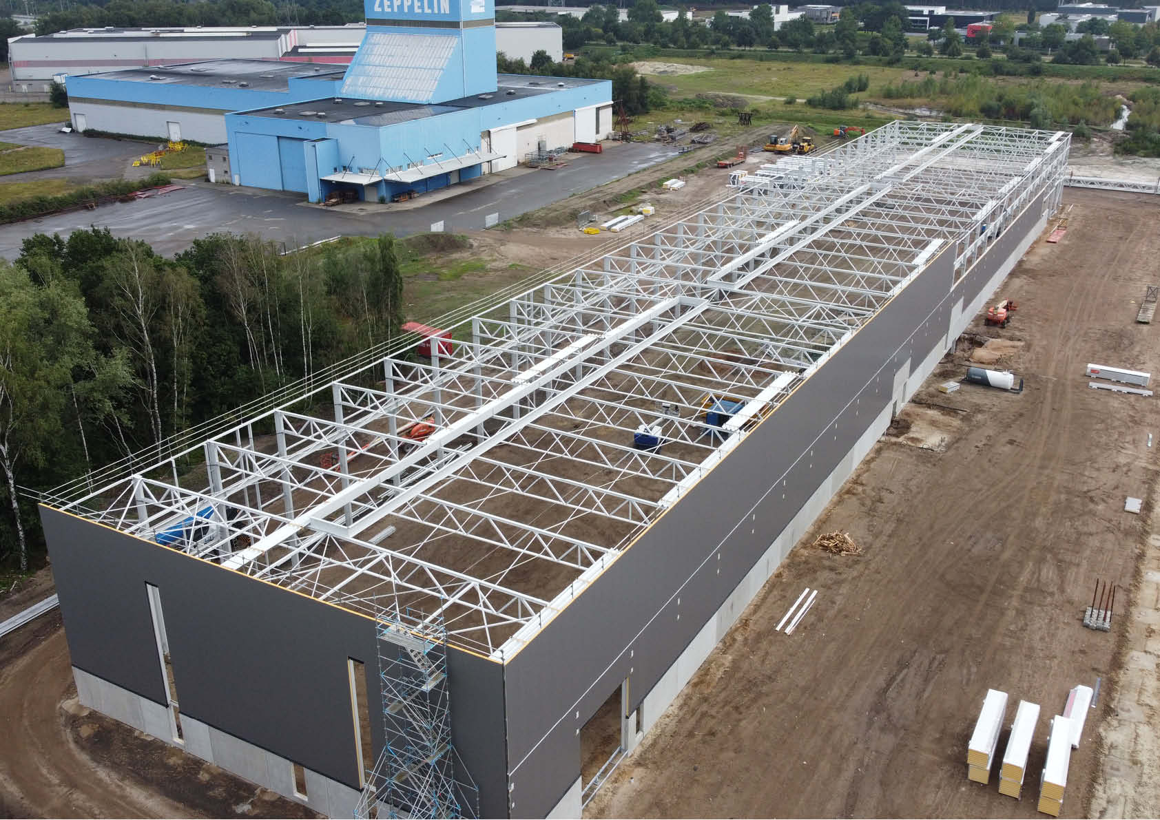 Les applications d’acier dans le cadre du projet concernent l’ensemble de la construction, comprenant des colonnes, des poutres en treillis, des rails de grue, le revêtement de façade constitué de panneaux sandwich isolés et de panneaux de toit profilés en acier.
