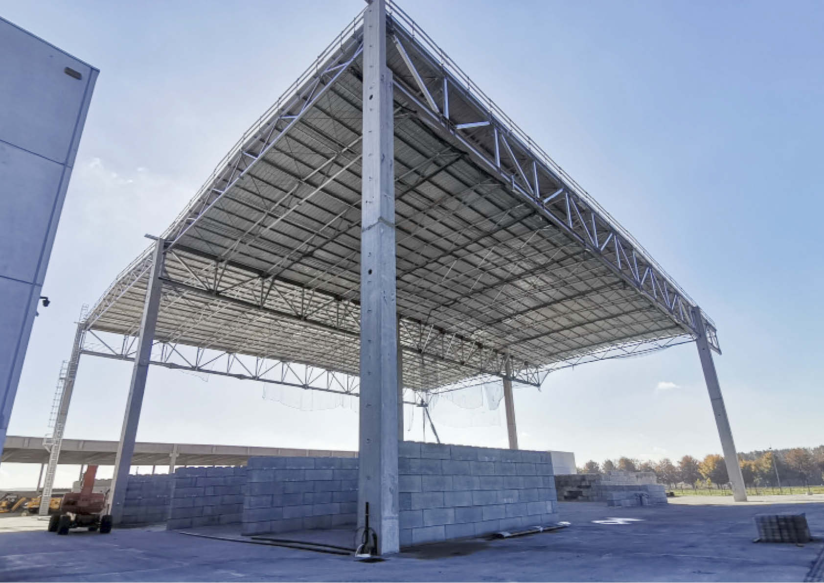 Un auvent en acier, soutenu par six colonnes en béton, couvre les deux axes de circulation et constitue le pôle d'attraction de la conception. Le projet a un aspect industriel avec quelques éléments ludiques.