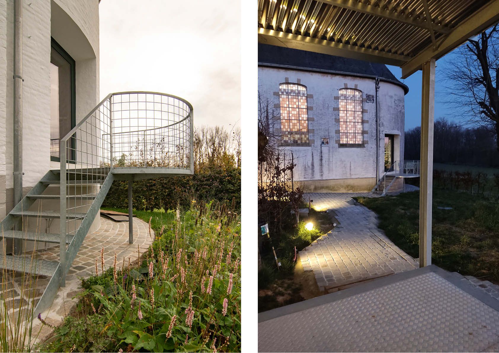 Deux planchers intermédiaires en acier profilé sont en porte-à-faux au-dessus d'une structure de porche sur l'axe central de la chapelle. Le chœur semi-circulaire, l'ancienne porte d'entrée, les bordent avec précision. Un mince escalier en acier en colimaçon aux marches plissées relie les différents étages. Une nouvelle porte unique dans le chœur rompt le caractère fermé de la chapelle et offre une vue étendue sur les champs situés derrière. La structure légère en acier est dissociée des murs et est fixée de façon minimale au bâtiment existant.
