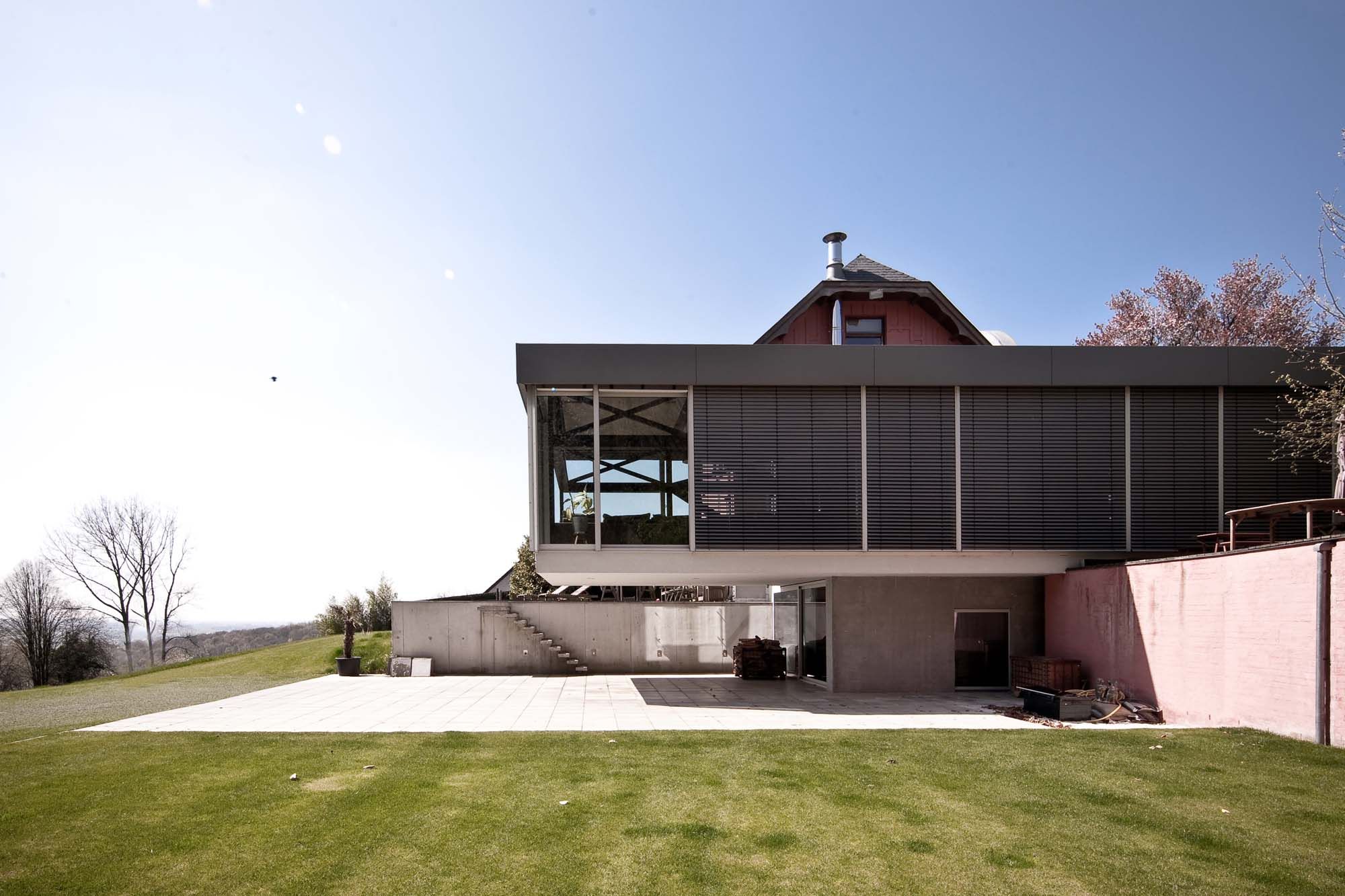 Au sommet d’une côte des Ardennes flamandes, une maison de campagne pleine de charme s’est vu adjoindre une extension étonnante. Le souci majeur de ce projet était de tirer le meilleur parti du panorama sur les environs. Au niveau de la cave, l’extension est limitée : un tube central en massif rend la construction plus aérienne. De grands treillis en acier d’une longueur totale de plus de 15 m ont été accrochés à cette fin au noyau central. Du côté pente, les forces de traction sont dérivées via des tirants vers le pied des fondations sous le noyau central. Un porte-à-faux de près de 6 m est ainsi créé du côté où le sol est plat. L’enveloppe extérieure du nouveau volume en saillie est complètement vitrée, ce qui renforce encore davantage le rôle de décor tenu par l’environnement. Dans ce projet, le choix de l’acier s’est révélé essentiel pour matérialiser à la fois le caractère aérien et l’ouverture sur l’extérieur. De même, il a permis de façon remarquable de laisser le treillis visible dans sa totalité.