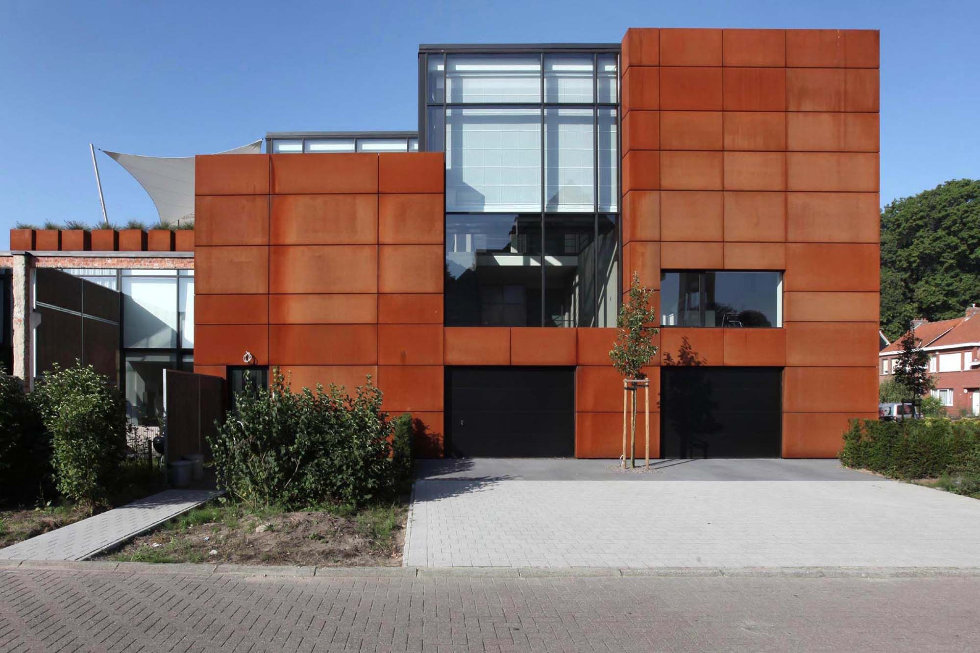 L’entrepôt à rénover appartenait à une grande scierie. La structure consistait en une ossature en béton et des murs de façade massifs. Le nouveau projet vient se greffer sur cette structure. Pour la façade, cela signifie un ‘imperméable’ léger sous la forme d’une façade à cassettes en acier autopatinable et un ‘chandail’ constitué d’une isolation thermique associée aux grandes façades en voile de verre. L’acier autopatinable vieillit, se décolore et vit réellement avec son environnement ; une référence au passé industriel de Boechout. C’est ainsi qu’un ancien bâtiment industriel entame une seconde vie.