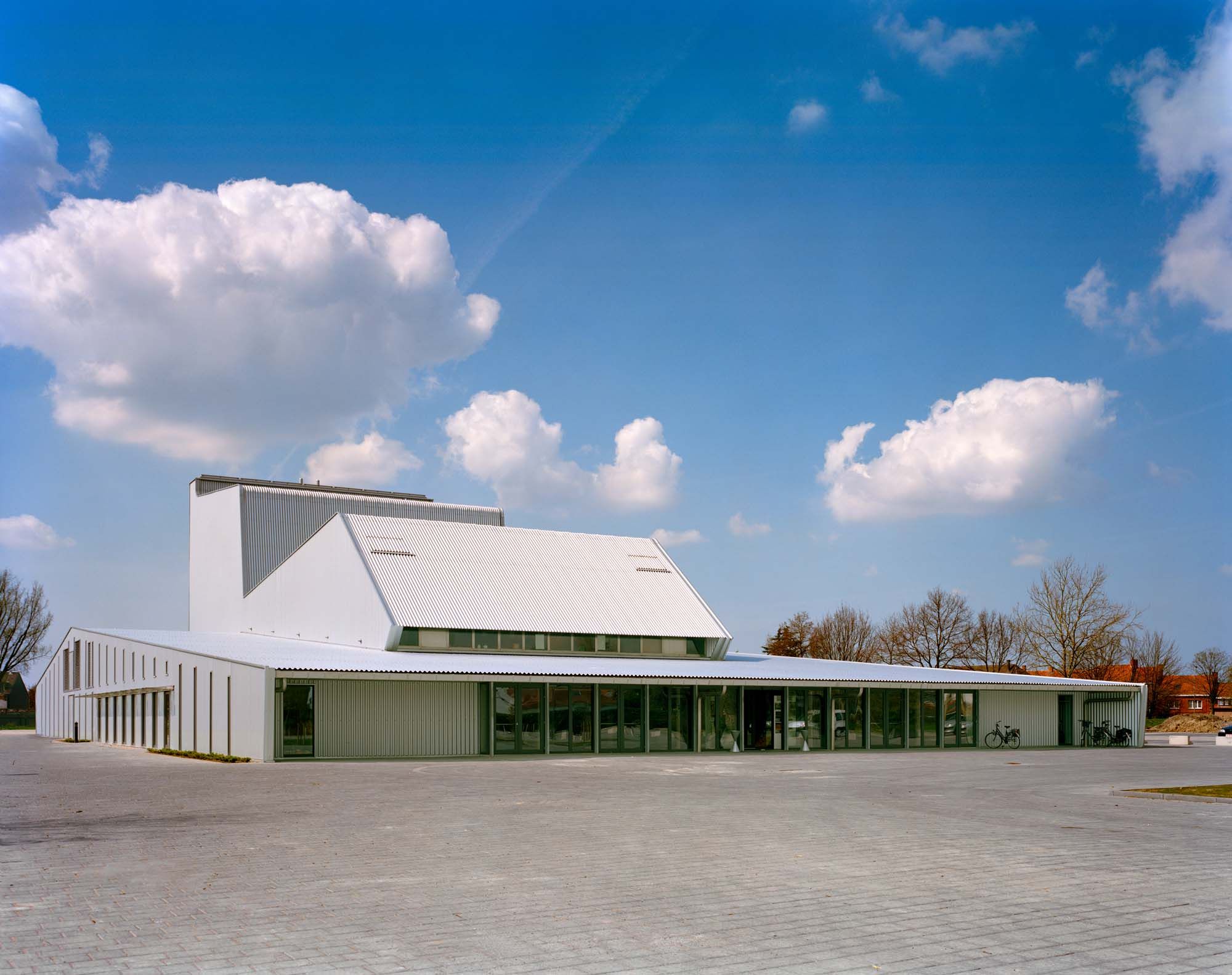 Un parc en périphérie de la ville reçoit la salle polyvalente (spectacle et musique), ainsi que des locaux conviviaux pour le troisième âge. La scène et la salle, avec sièges escamotables, précédées par le foyer forment la nef centrale de l’édifice. Elle est flanquée par deux ailes latérales abritant cafétéria, salles polyvalentes, foyer des artistes, loges, remise et locaux techniques. Quelques locaux administratifs viennent aussi se glisser sur deux niveaux entre la salle et le foyer. La structure en murs de blocs de béton armés et en hourdis de béton précontraints Rf est enveloppée de 15 cm de laine de roche et d’un manteau économique en tôle ondulée d’acier laqué, tant en toiture qu’en parois extérieures. Le profil ondulé des tôles augmente encore le côté expressif des formes puissantes du bâtiment. Le projet prévoit deux grands auvents qui prolongent les ailes latérales et ondulent au-dessus des allées d’accès.