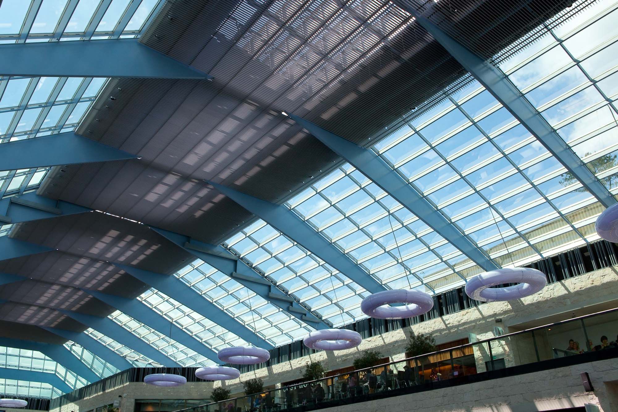 Pour le nouveau centre commercial K à Courtrai, une des plus grandes coupoles du pays a été conçue. Elle mesure 112 m de long et 32 m de large. La structure est constituée de 13 fermes franchissant les 32 m ; l’entre-axe est de 8 m. Ces fermes portent les pannes en acier qui font office d’appui de basculement pour les fermes. Les fermes elles-mêmes sont en tôles, soudées les unes aux autres pour former des poutres caissons, et ont une largeur de seulement 150 mm. Le choix de l’acier fut vite fait, vu le poids propre, la forme et la finesse de la structure portante. L’ossature en béton du centre commercial réagissant différemment aux variations de température que la structure en acier de la coupole, les appuis des fermes en acier ont une certaine liberté de mouvement dans l’axe longitudinal de la coupole.