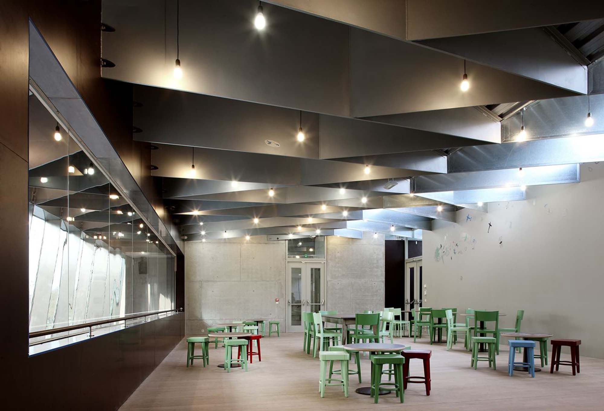 Enfin, le toit spectaculaire côté rue supporte le plancher du bar à champagne au moyen de montants. La structure est constituée de 9 ailettes en acier assemblées en chevrons.