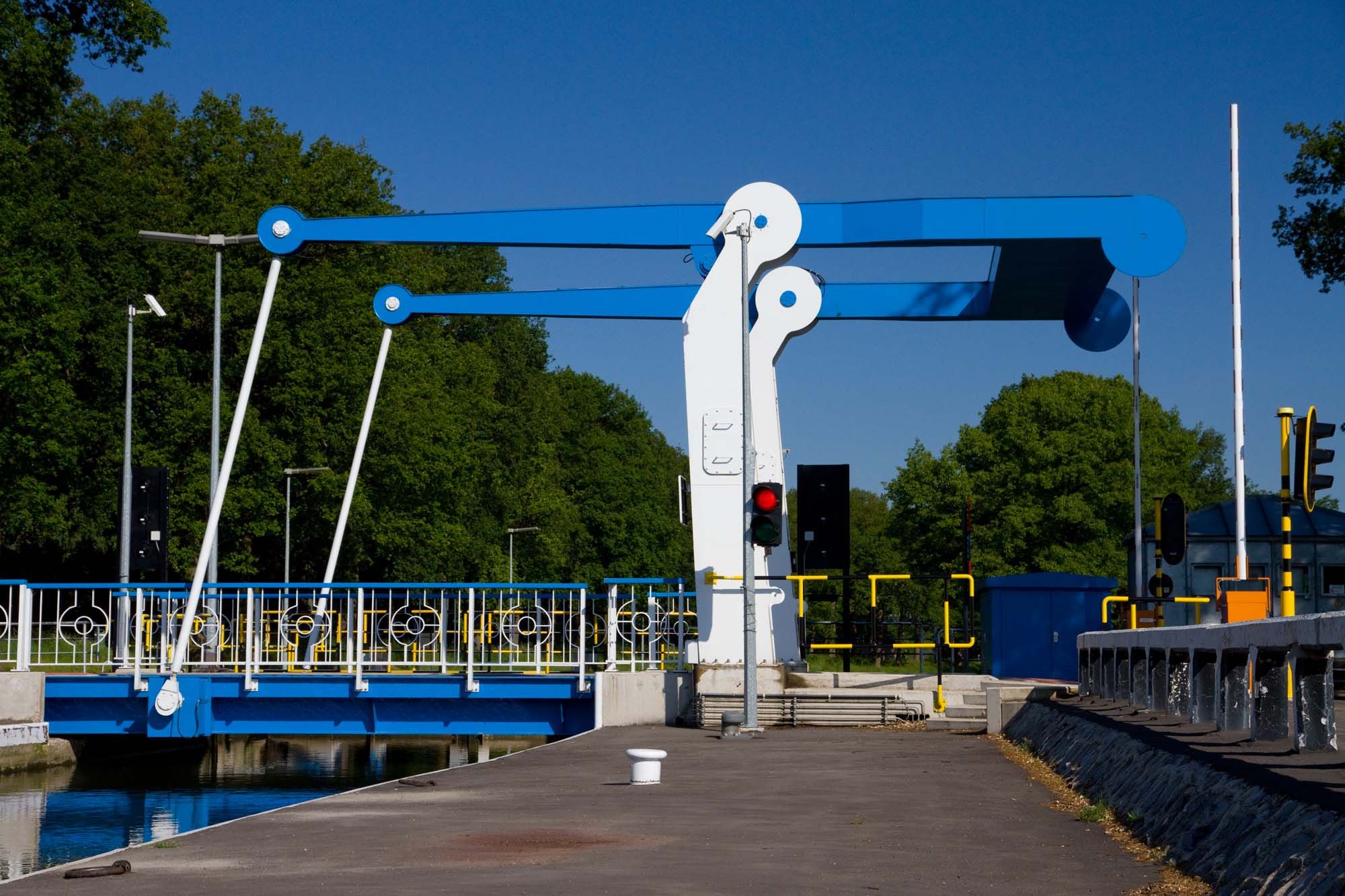 À Bocholt, le pont basculant de l’écluse n°18 du Zuid-Willemsvaart devait être entièrement remplacé. Le nouveau pont se compose du tablier basculant, des pylônes portant le contrepoids et des bras de balancier avec la caisse comme contrepoids. Toutes ces parties sont en tôles d’acier de qualité S355 J2G3. Les dimensions du tablier du pont sont de 6 x 10 m. Les pylônes portant le contrepoids ont une hauteur de 6 m. Ce colosse pèse environ 50 tonnes.