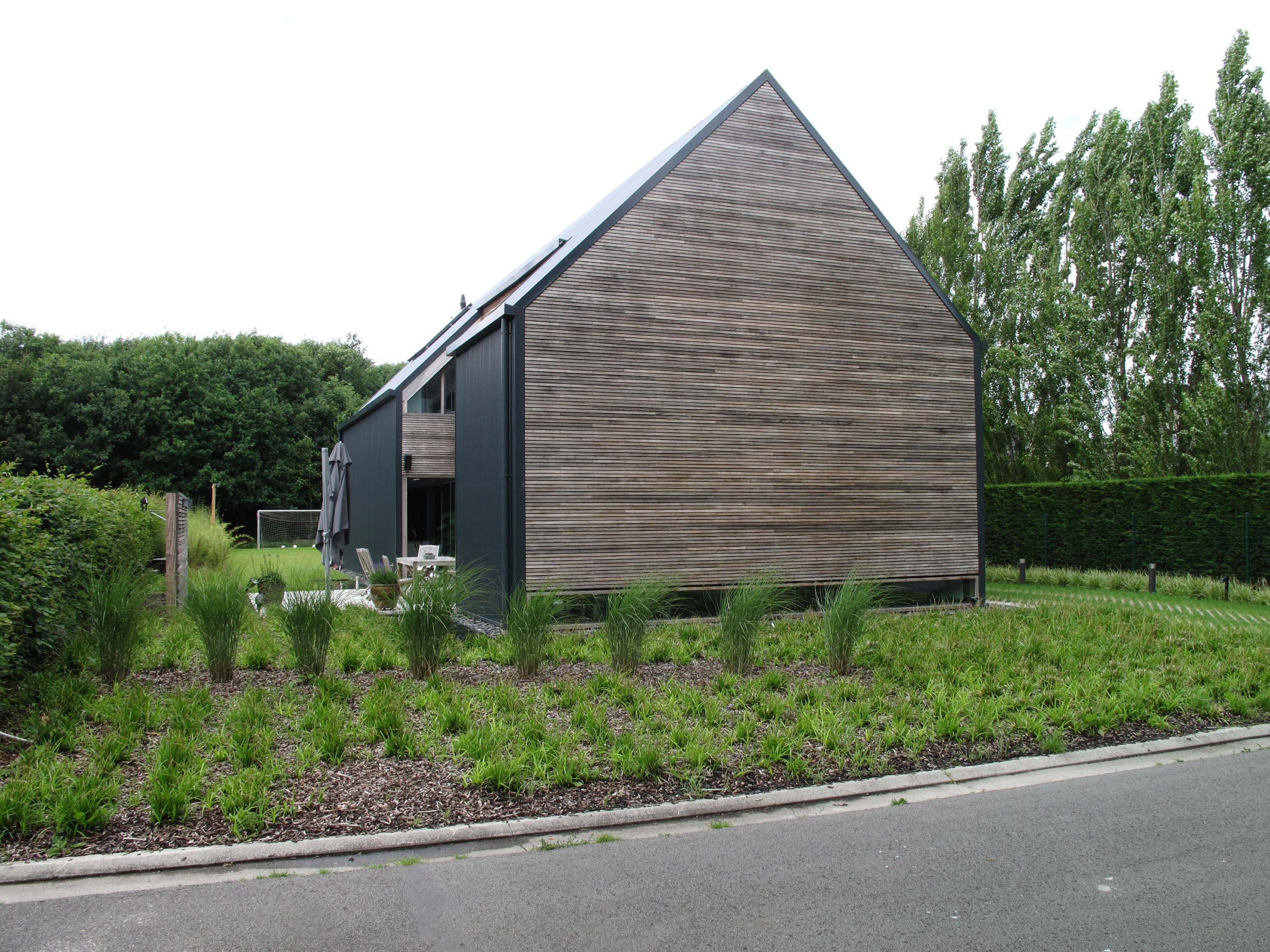 Een slank staalskelet met HEB100-kolommen en IPE200-liggers vormt de dragende structuur. De gevelbekleding in zwarte gegolfde profielplaten, met accenten in padoek beplanking, geeft het geheel toch een monoliet karakter. De verdiepingsvloer wordt grotendeels opgehangen aan de dakliggers, met een uitgestrekte leefruimte als resultaat. Koele materialen zoals de galva-steeldeckplaten, een zwart gepolierde betonvloer, een stalen trap en een glazen loopvloer worden ruimschoots gecompenseerd door de parketvloer op de verdieping en het buitenschrijnwerk in padoek.