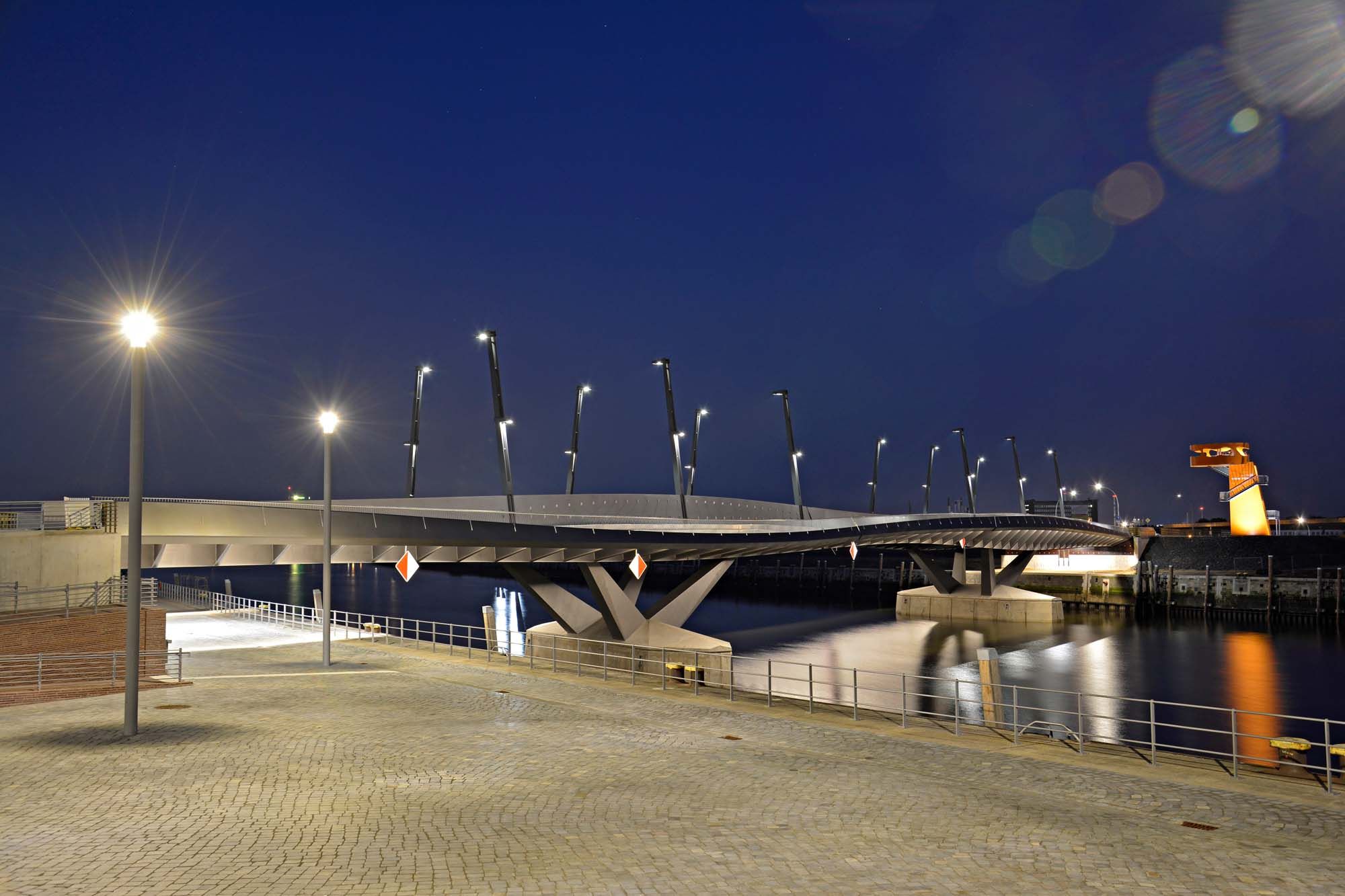 Le Pont de Baakenhafen se trouve dans la HafenCity, un nouveau district urbain sur le port d’Hambourg en plein développement. Le nouveau pont enjambe un ancien bassin du port de mer sur l’Elbe.