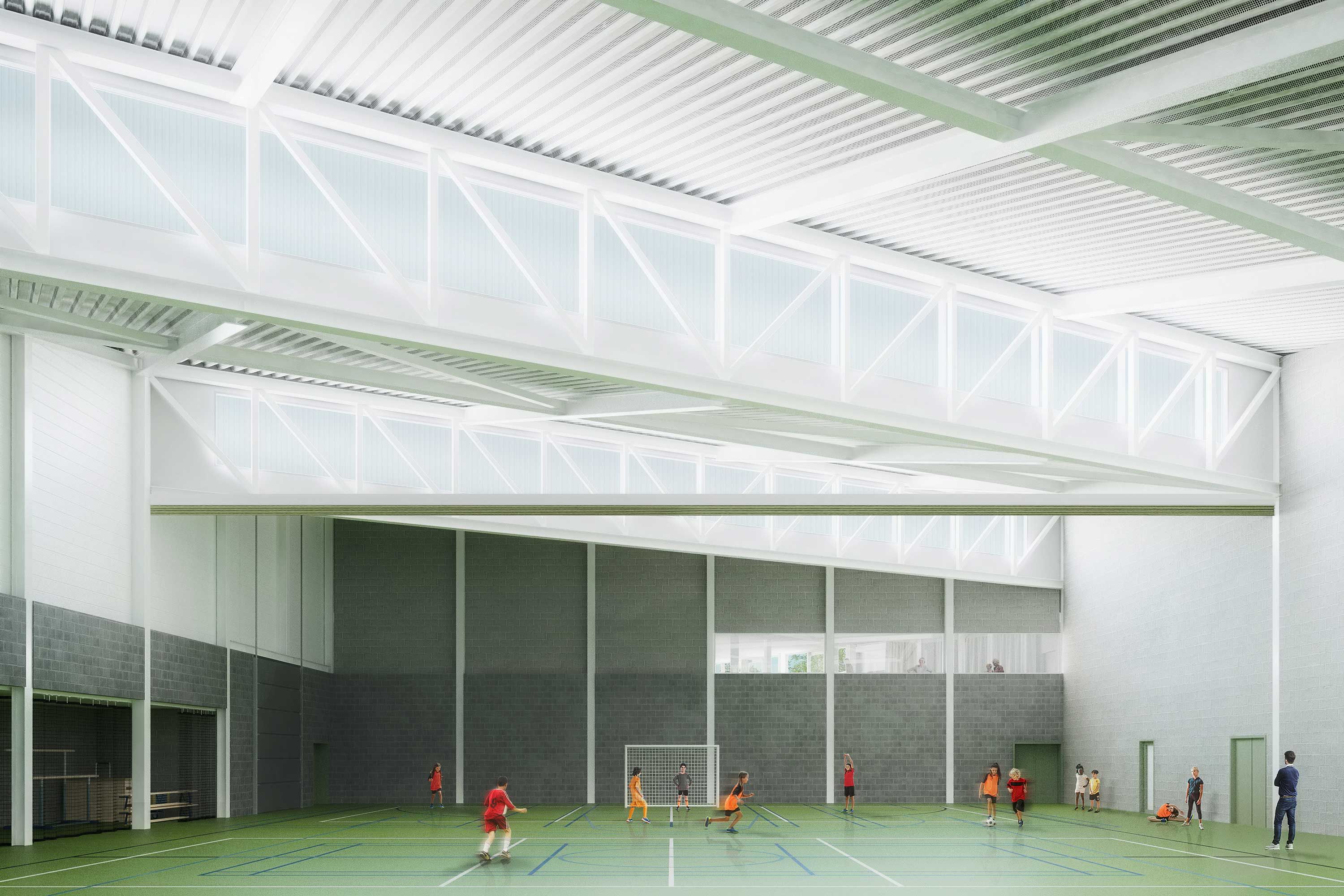 Le nouveau bâtiment d’entrée avec salle de sport, brasserie et bureaux apporte une valeur ajoutée au domaine et à ses environs immédiats. En centralisant diverses fonctions en un seul endroit, il contrebalance la fragmentation des bâtiments de faible hauteur sur le site. Le bâtiment est placé près de l’eau afin d’obtenir une relation optimale avec l’eau et la verdure environnante.