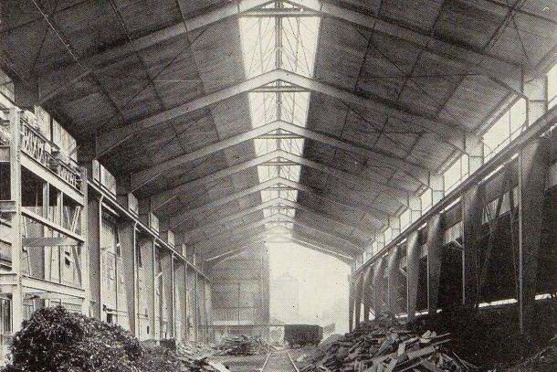 De nieuwe schroothal, gebouwd voor S. A. des Usines Emile Henricot in Court-Saint-Etienne werd gebouwd volgens een ontwerp dat gewoonlijk niet wordt toegepast in een industriële hal van dit type: draagbalken met massieve kern (lijf). De volledig gelaste constructie, zowel in de werkplaats als tijde…