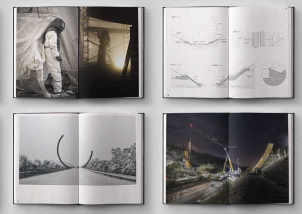 Snelweg E411 tussen de provincies Namen en Luxemburg (België), kilometerpaal 99. Op de top van een heuvel valt de Arc Majeur op met zijn majestueuze lijnen. De monumentale sculptuur in weervast staal (‘corten’), werk van de kunstenaar Bernar Venet, omringt de weg aan beide zijden.