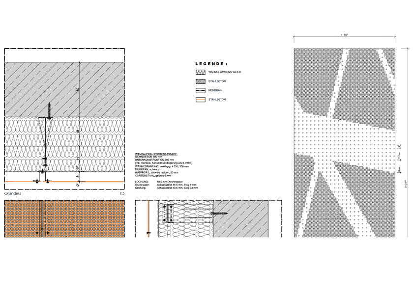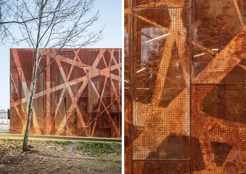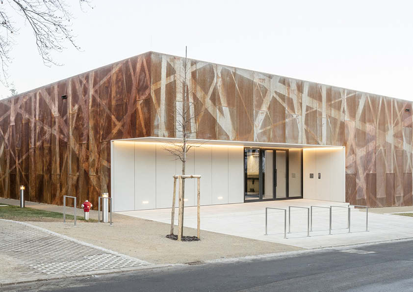 Deze 3000 m2 grote sporthal is bekleed met een gevel in geperforeerde weervast staalpanelen (corten). Aangezien hij geïnspireerd is op de natuur en de omliggende bossen, creëert de cortenstaalgevel de beoogde ruwe, natuurlijke uitstraling. Andere troeven zijn het economische aspect en de lange levensduur. De perforaties genereren een beeld van kriskras door elkaar lopende stroken met verschillende breedtes. Elk geperforeerd metaalpaneel is uniek om de continuïteit van de patronen te garanderen. Ze zijn ook doorgetrokken naar het interieur. Vanaf de inkompartij heb je een royaal uitzicht op de zitjes van de toeschouwers en het sportveld beneden. Achter de tribunes blijven de perforaties zichtbaar. Dit draagt bij tot de creatie van een unieke lichtbeleving en filtert de zichtlijnen naar de straat. De openingen in de gebouwschil, die ongewoon groot zijn voor een sporthal, zijn strategisch gepositioneerd om de band met de omgeving te versterken.
