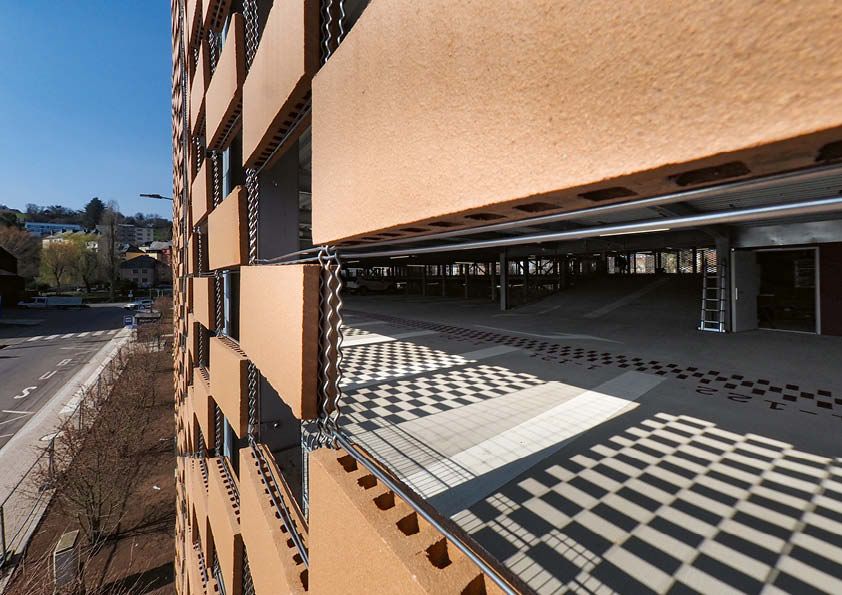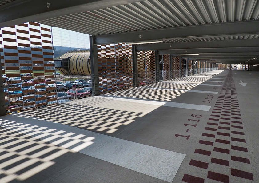 Deze publieke parkeergarage van drie verdiepingen is gebouwd in een overstromingsgebied en heeft een totale capaciteit van 502 plaatsen (inclusief een lift). De belangrijkste structurele elementen maken gebruik van gelaste plaatliggers op maat voor de kolommen en balken, gecombineerd met beton met behulp van deuvels. Om het gewicht van de constructie en de afmetingen van de profielen te beperken, zijn de kolommen en liggers vervaardigd in staalkwaliteit S460. Vooraf werd er in de fabriek een anticorrosiebehandeling toegepast. Doordat de balken zo gedimensioneerd zijn dat ze zelfdragend zijn bij de plaatsing van de vloerplaten, konden de werkzaamheden snel en efficiënt verlopen. Om het gebouw visueel te verfraaien, is een flexibele huid aan het metalen frame van de constructie bevestigd. Dit bestaat uit een gevlochten grid van staaldraden, waarin geëxtrudeerde stukken gebakken klei zijn aangebracht.